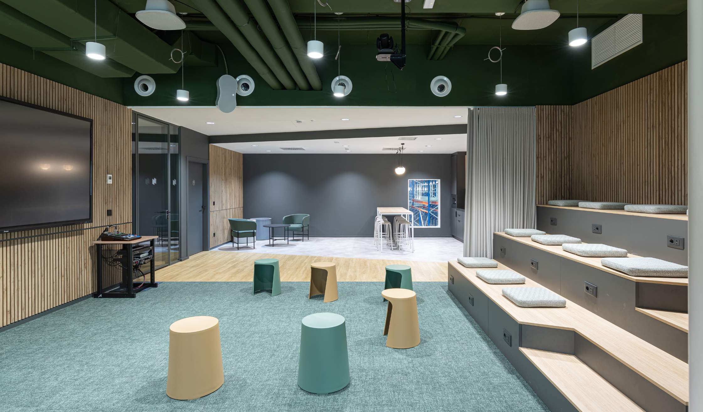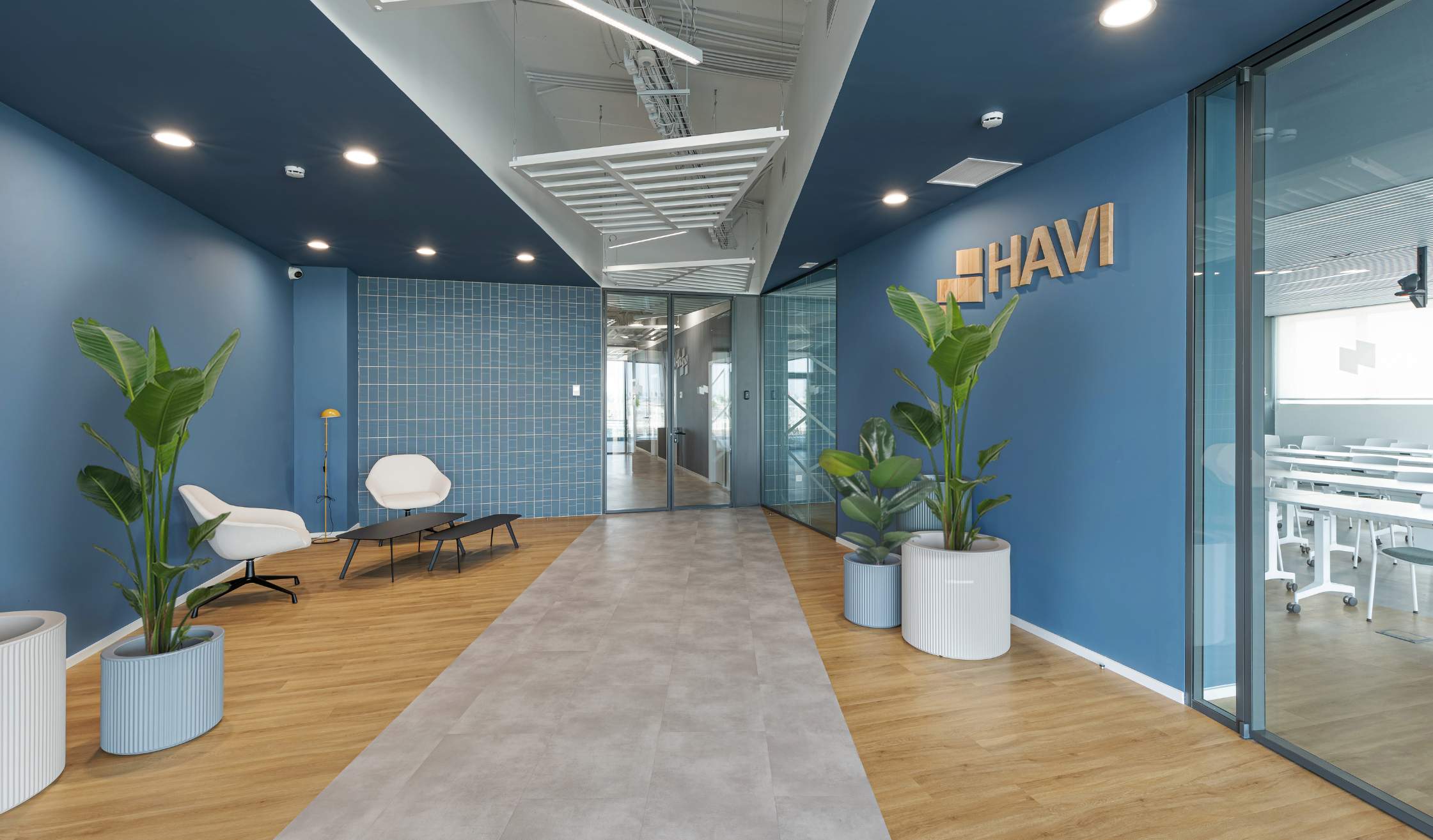 Por otro lado, la identidad corporativa de HAVI Spain se trasladó al espacio a través de vinilos en mamparas, señalética en escaleras y accesos, así como rótulos integrados que aportan coherencia visual al entorno. La reinterpretación de los colores corporativos en tonos azules y verdes, aplicados en elementos acústicos, suelos y mobiliario, aporta frescura y un sello propio al diseño final.