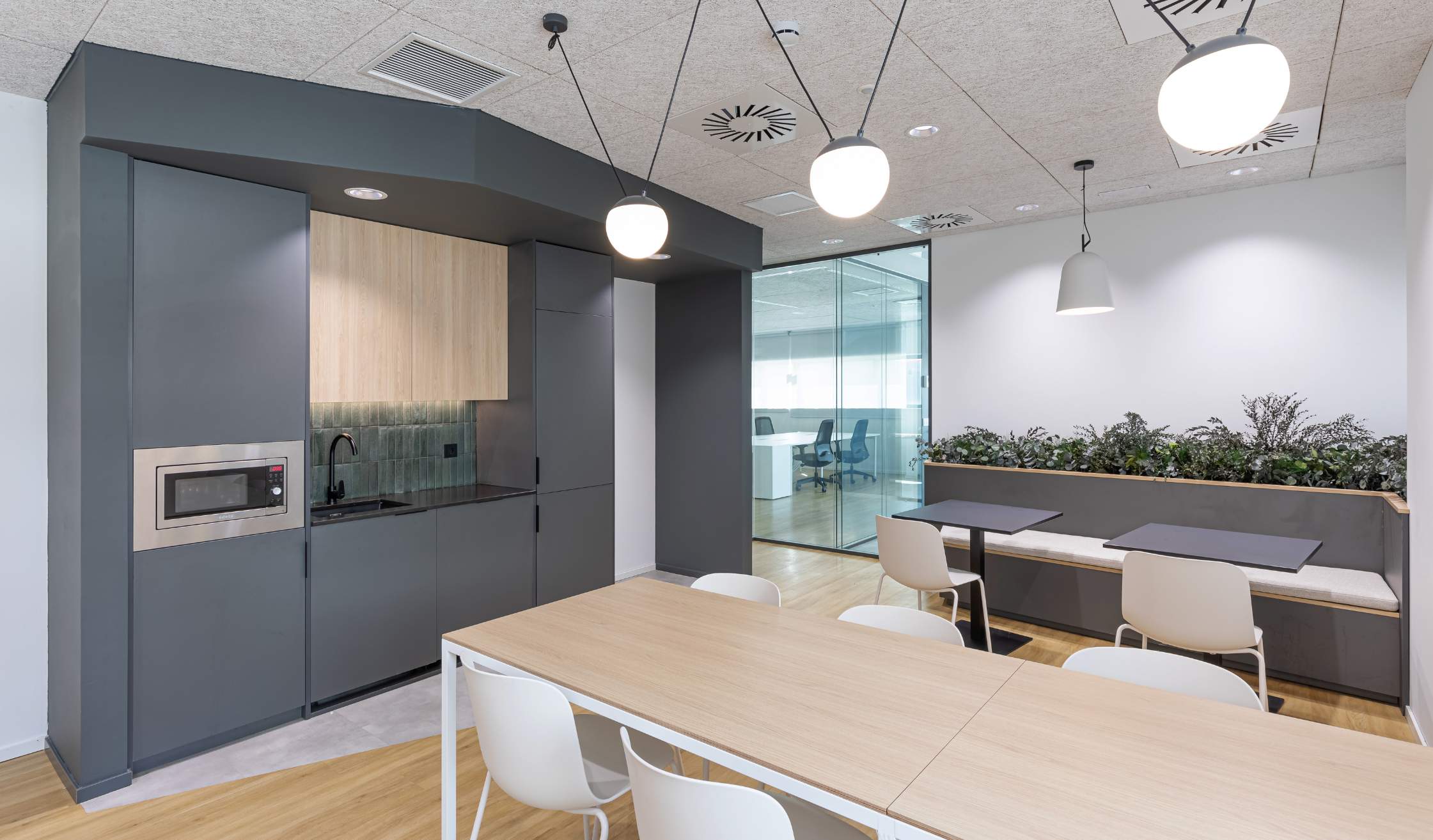 - Además, se completó el espacio con elementos originales, como paneles acústicos, mamparas dobles para mayor privacidad, pizarras de vidrio lacado y vegetación integrada, aportando frescura y calidez.