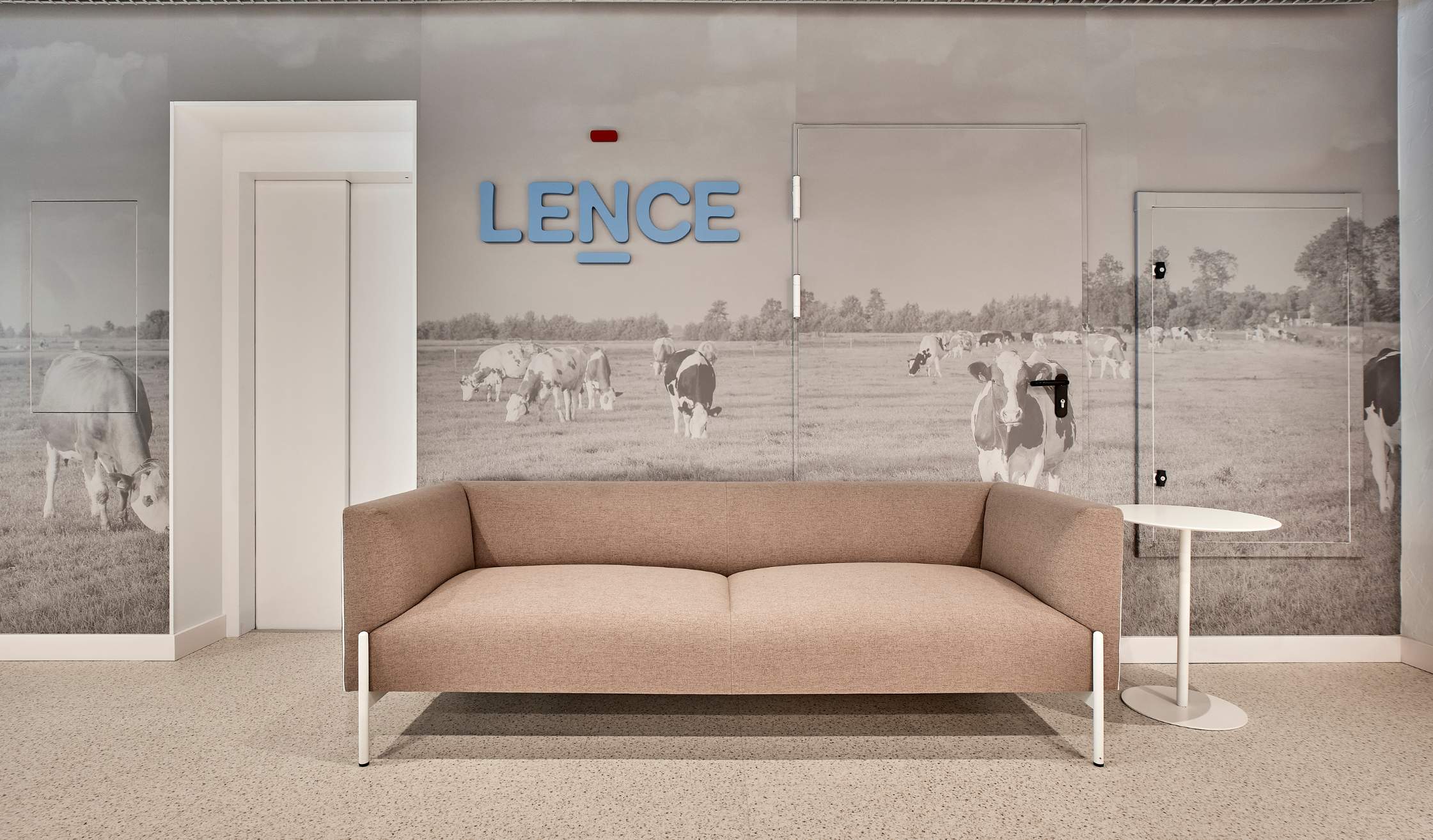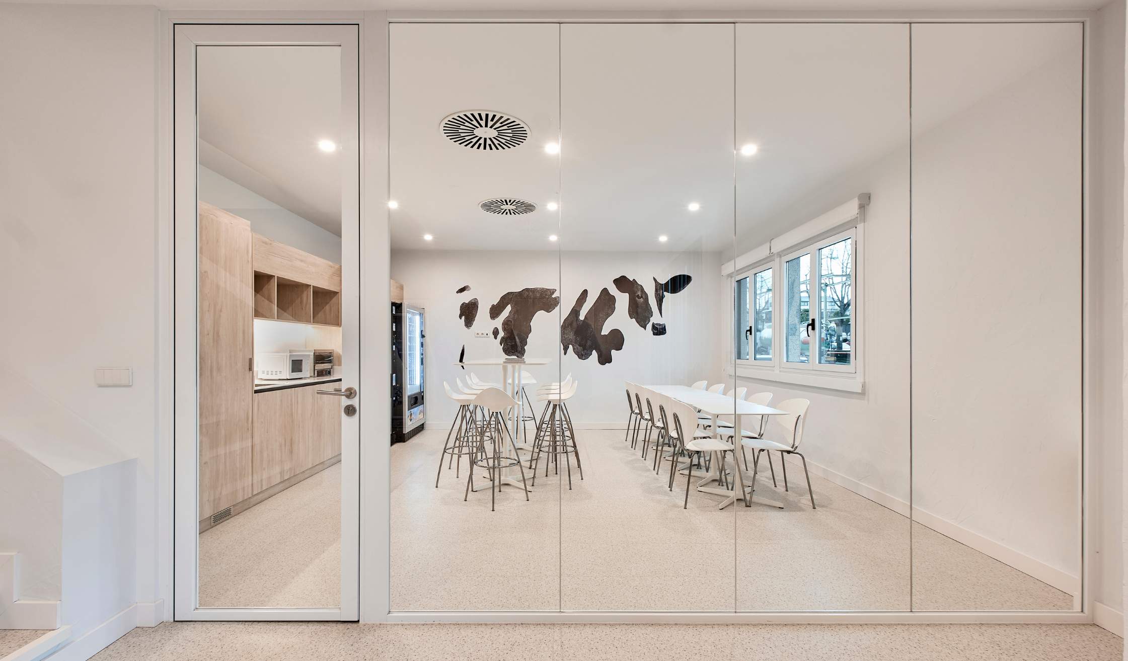 La inspiración en la materia prima del grupo, la leche, se traslada al diseño interior mediante superficies claras, texturas orgánicas y detalles formales que evocan fluidez y pureza.