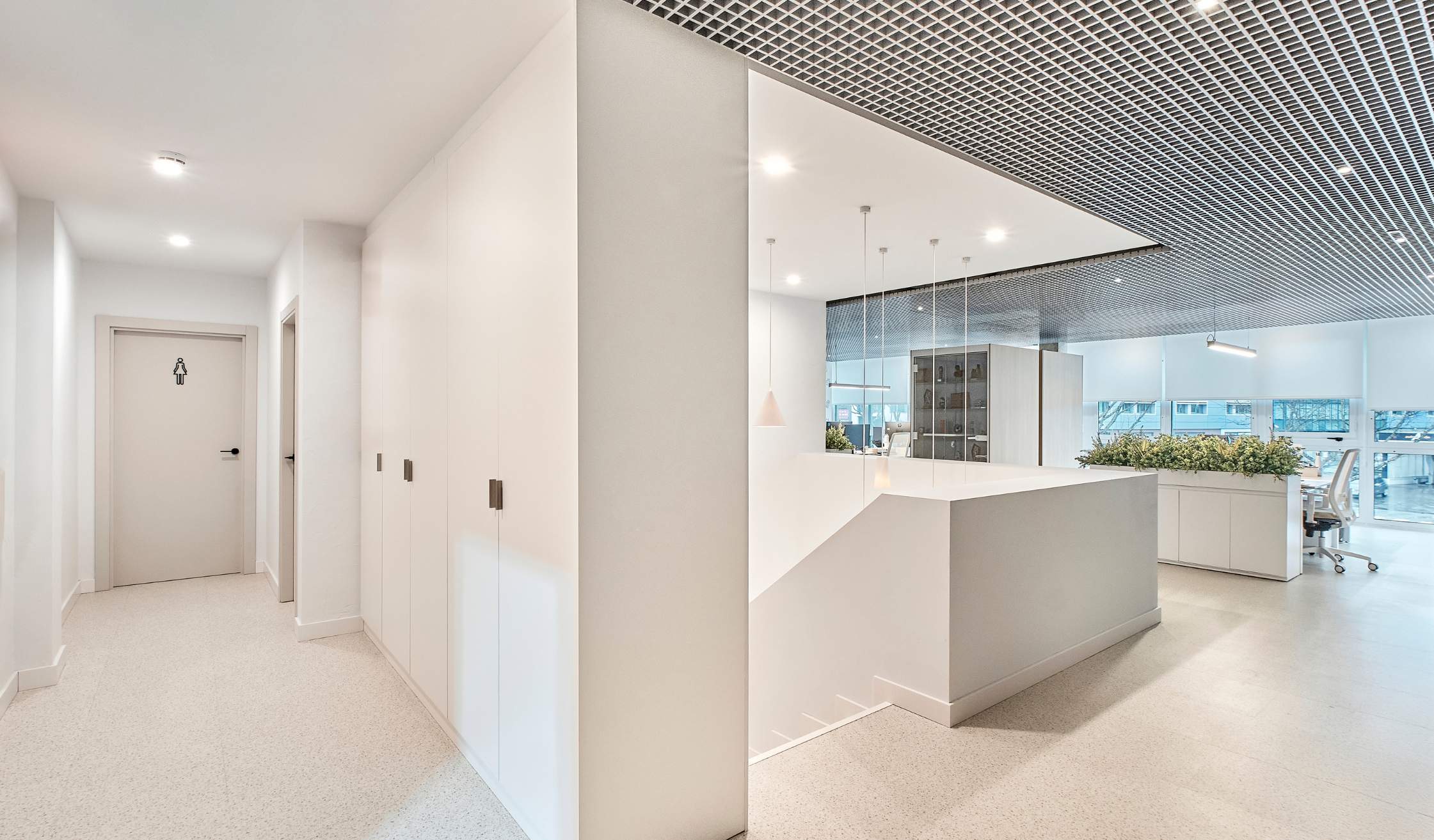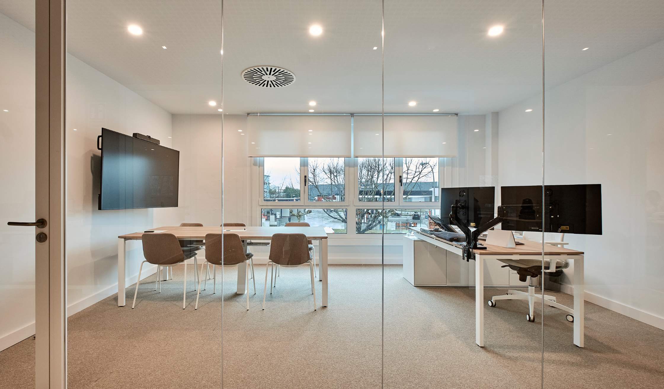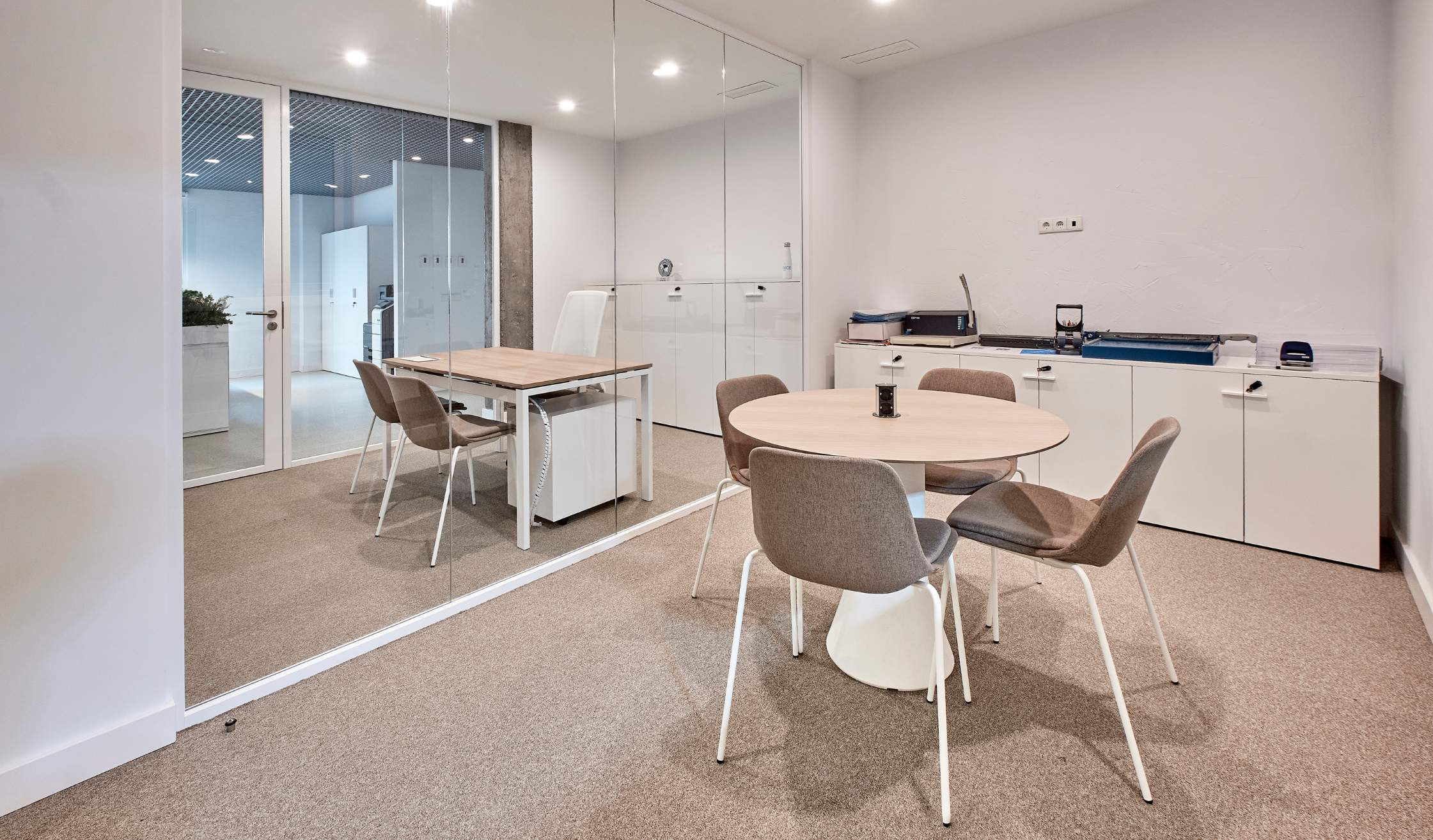 - Compartimentación con mamparas de vidrio para potenciar transparencia y continuidad visual.