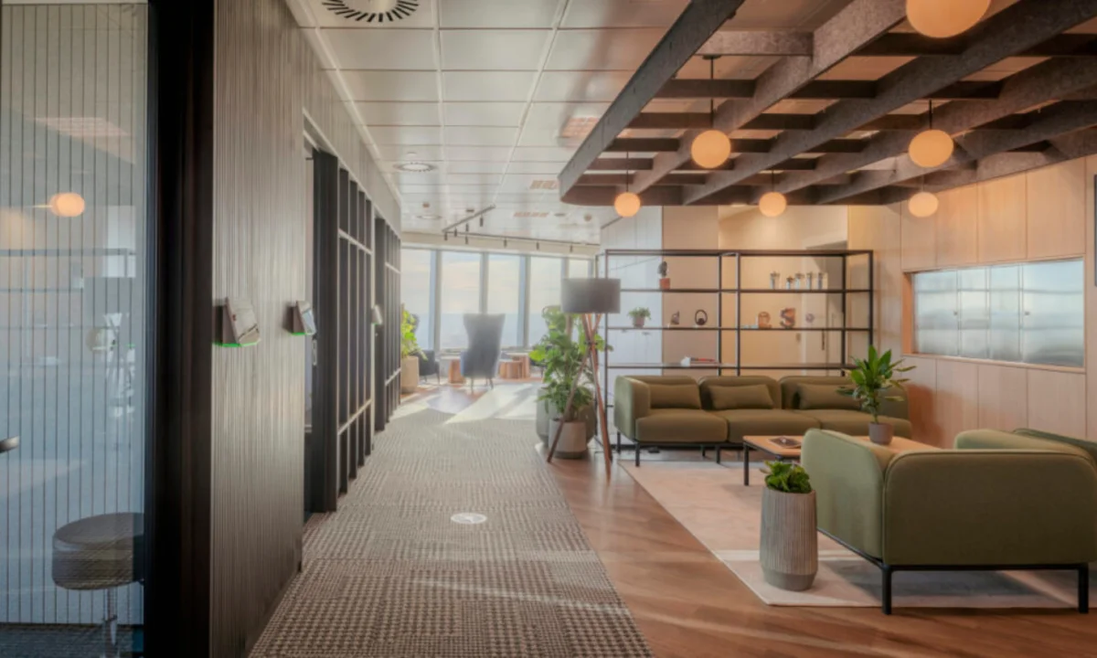 Además, las luminarias juegan un papel importante en todo el espacio, aportando no solo funcionalidad, sino también una luz envolvente que acompaña cada rincón de la oficina.