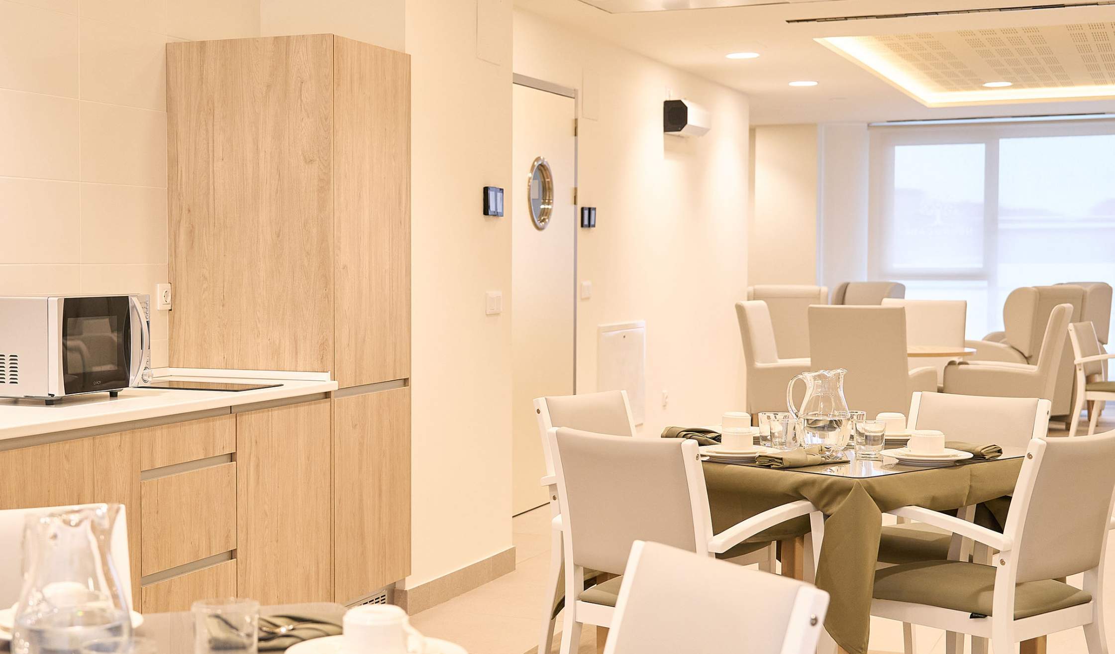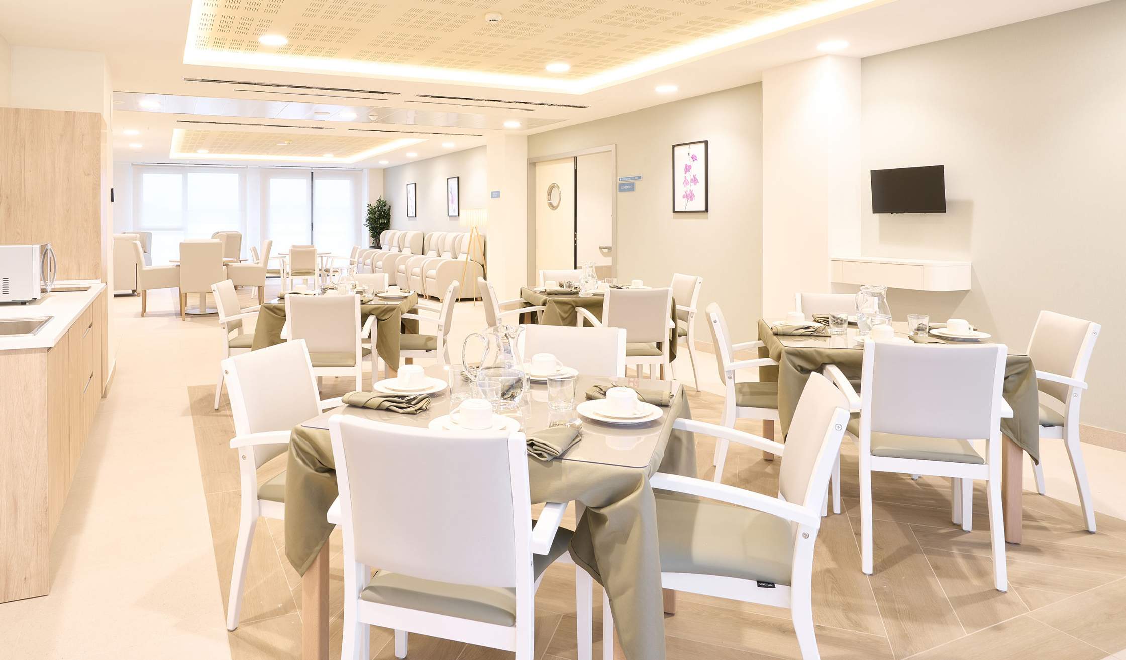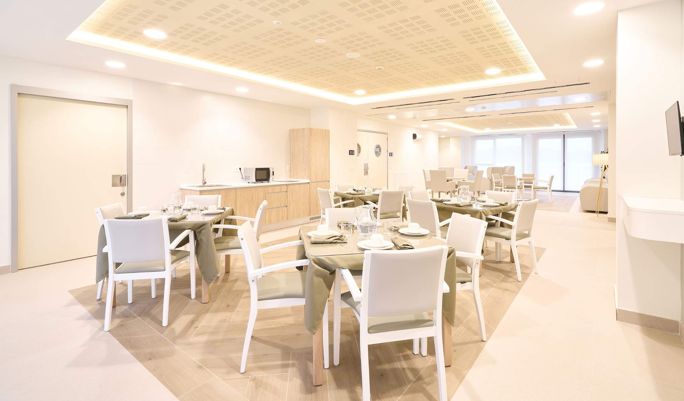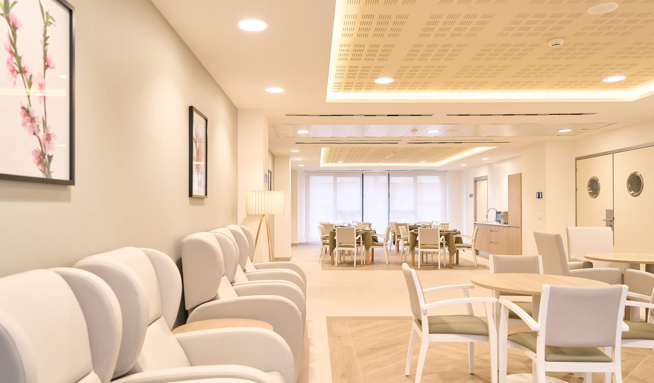 - Espacios comunes, como recepción, salas de convivencia, comedor, salas de estar, espacios polivalentes, cocinas comunes…