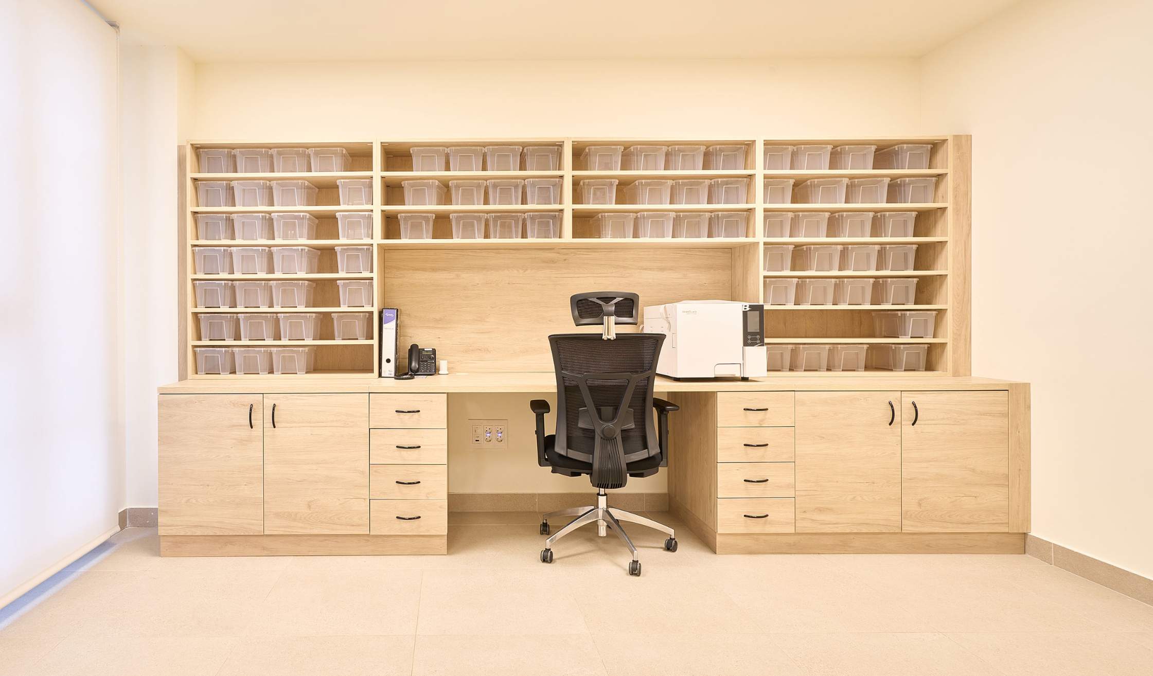 Farmacia: el gran mueble de farmacia se diseña y fabrica en los talleres del grupo, con casilleros a medida para gestionar los medicamentos de los residentes.