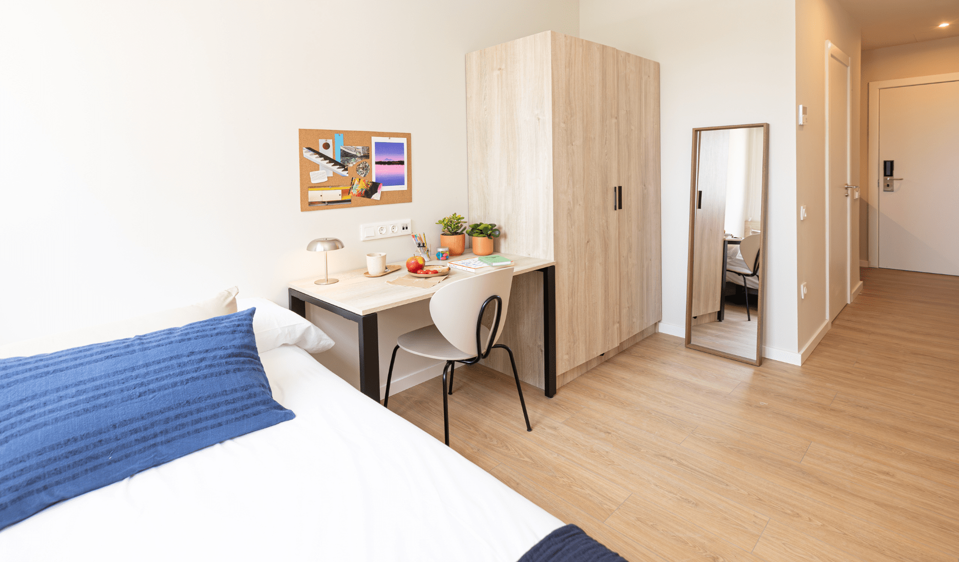 Cada habitación se equipó cuidadosamente con armarios, cabeceros, escritorios, sillas, mesas y muebles auxiliares a medida, además de paneles acústicos y apliques de iluminación, optimizando el espacio y creando ambientes acogedores y funcionales. Los baños cuentan con muebles estándar bajo lavabo. El conjunto de mobiliario y carpintería a medida asegura que cada habitación funcione como un verdadero refugio personal, integrando confort, organización y estética uniforme en toda la residencia.