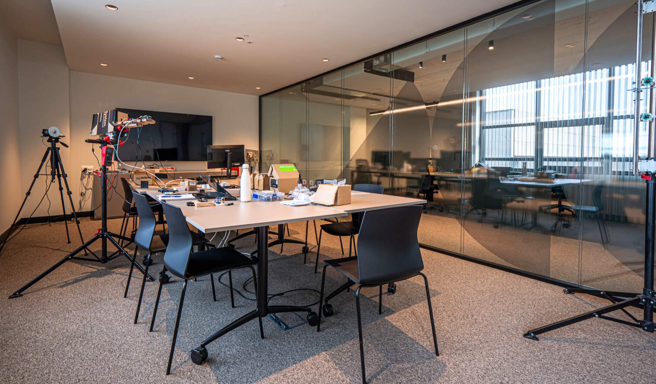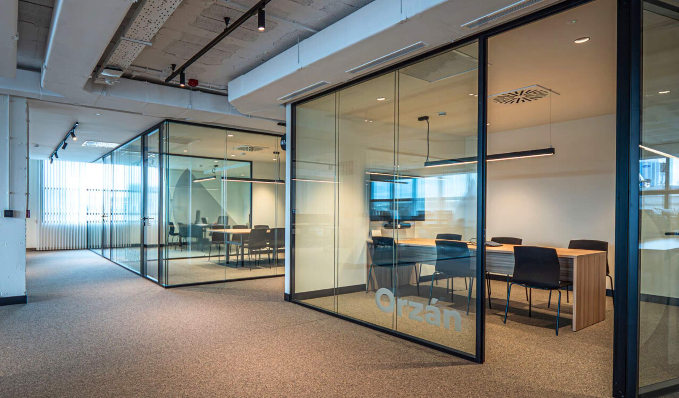 - Compartimentación mediante mamparas acristaladas, fabricadas en vidrio y con perfil de aluminio en negro.