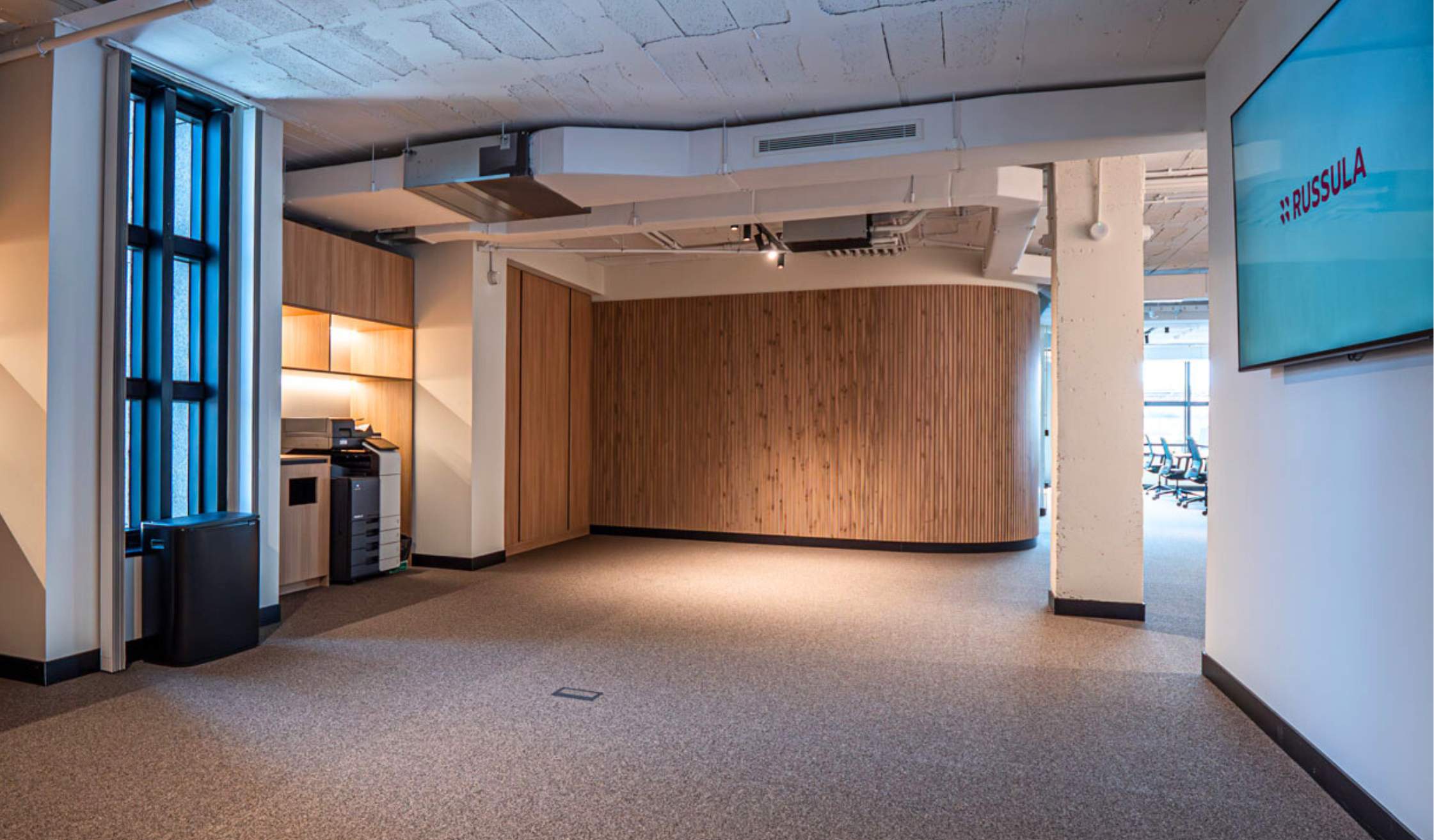 Desde Russula buscaban un Workplace innovador y funcional, que tuviese muchos espacios diáfanos sin renunciar a la privacidad que dan los despachos o salas de reuniones. Es decir, un entorno híbrido que combinase amplitud, luminosidad e intimidad.
