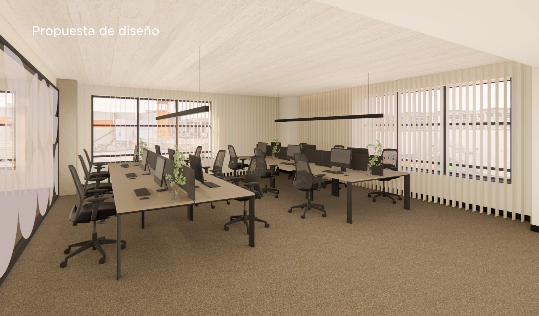 El espacio de trabajo se equipa con piezas de fabricantes de calidad, como puestos operativos, mesas de despachos, sillas auxiliares, mobiliario para zonas de reuniones, luminarias, laminados como cerramiento de ventanas…
