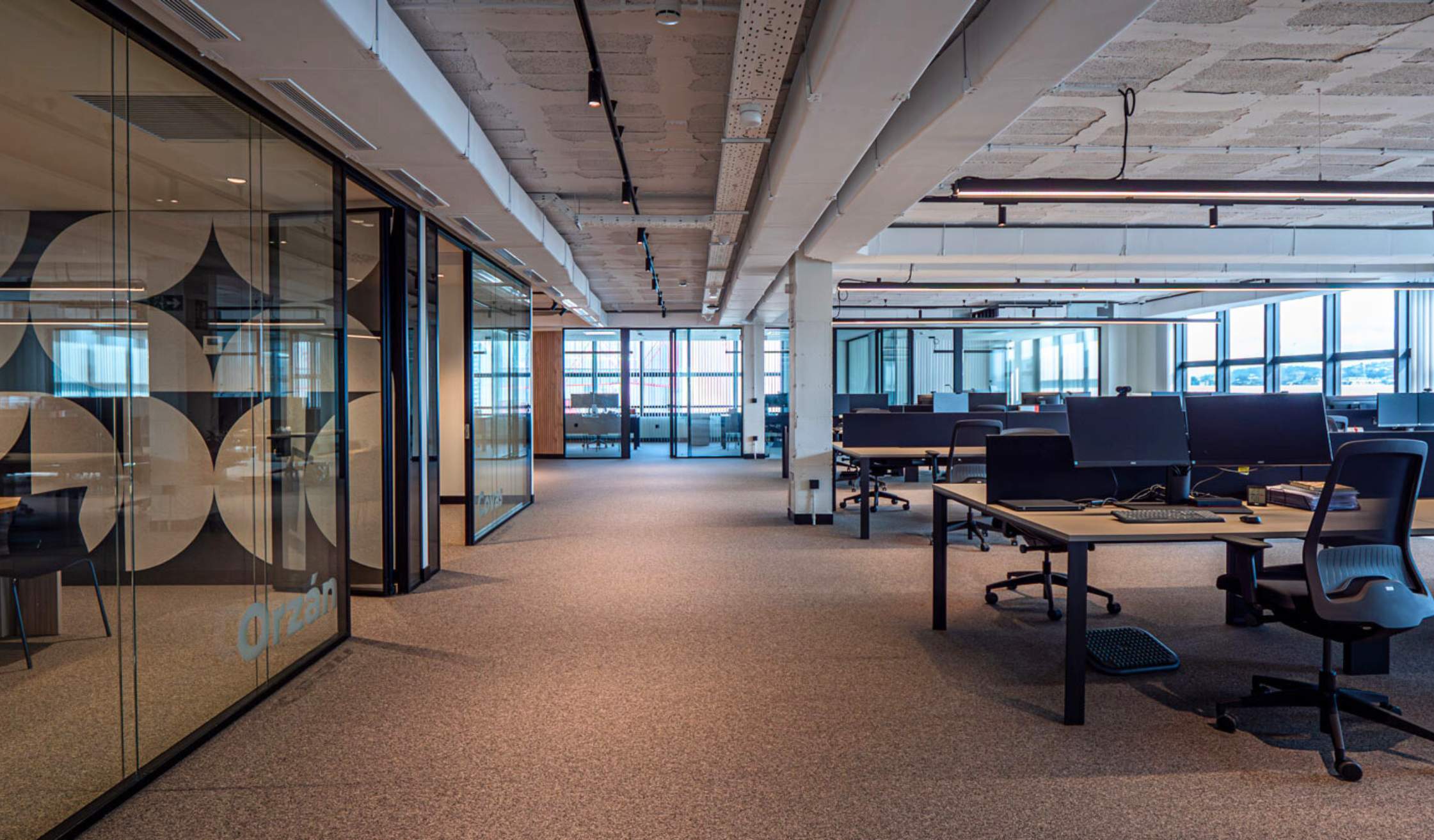 Una de las características a tener en cuenta a la hora de diseñar la nueva oficina era que el perímetro del edificio estaba compuesto totalmente por ventanal al exterior, lo que tenía la ventaja de una gran luminosidad natural, pero inconvenientes a nivel de climatización, instalaciones y posibles reflejos.
