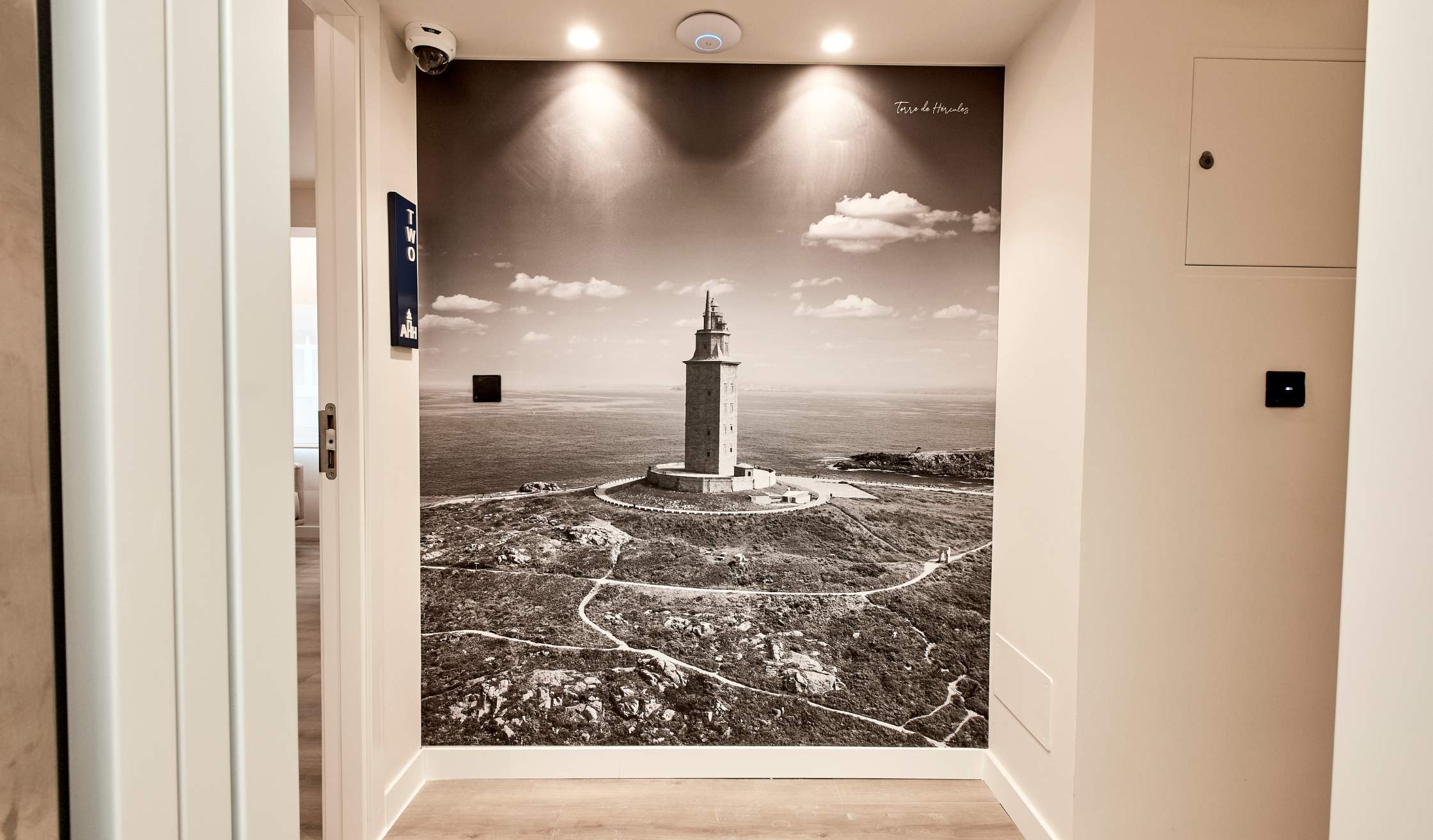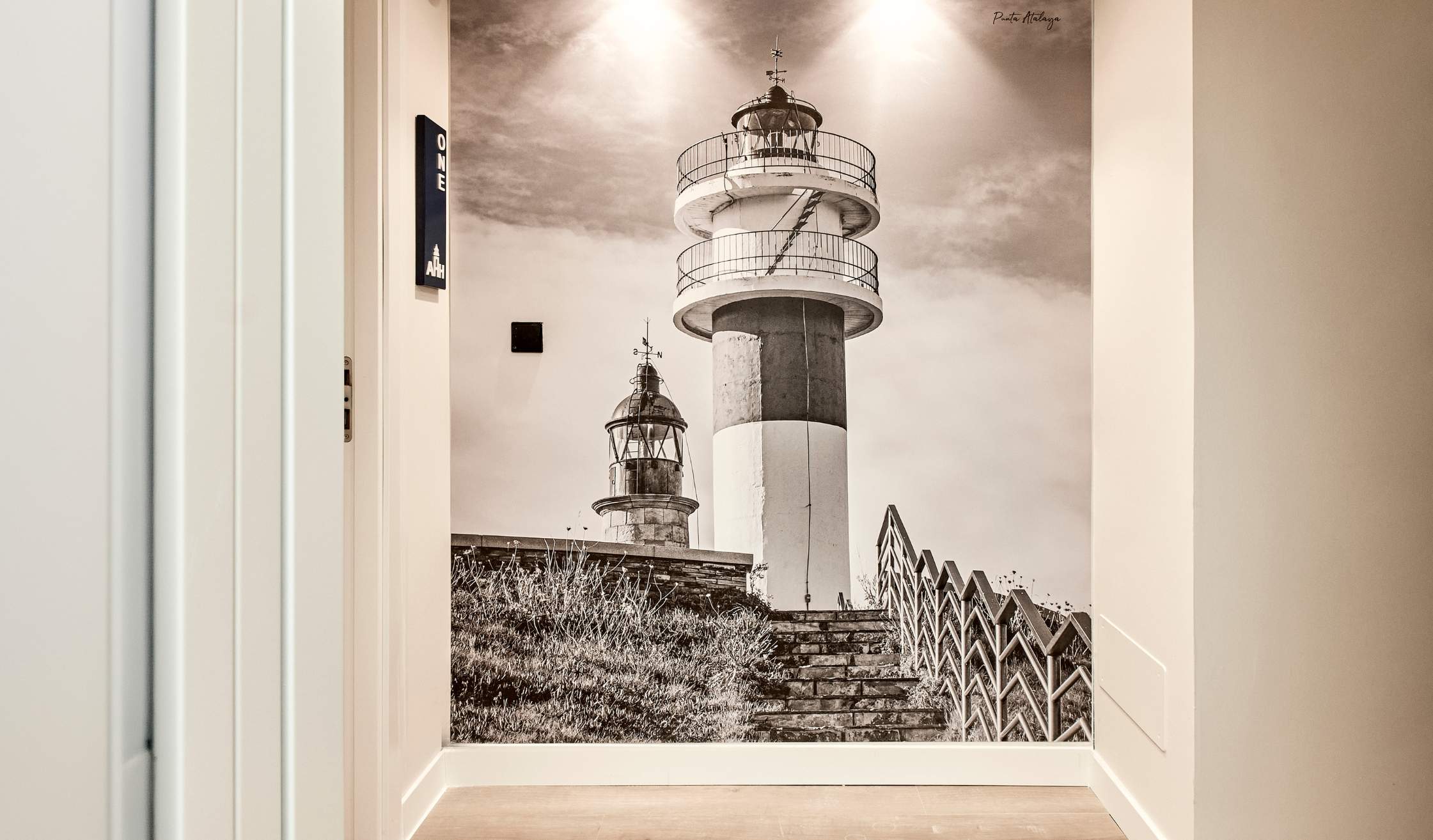 Para dar más personalidad a este espacio, se realizó la rotulación de los faros de la puerta de cada apartamento, inspirada en los faros gallegos, con un diseño claro y elegante que facilita la orientación dentro del edificio y aporta unidad al conjunto, ayudando a identificar cada acceso de forma sencilla y manteniendo una estética cuidada y coherente con el resto del proyecto.