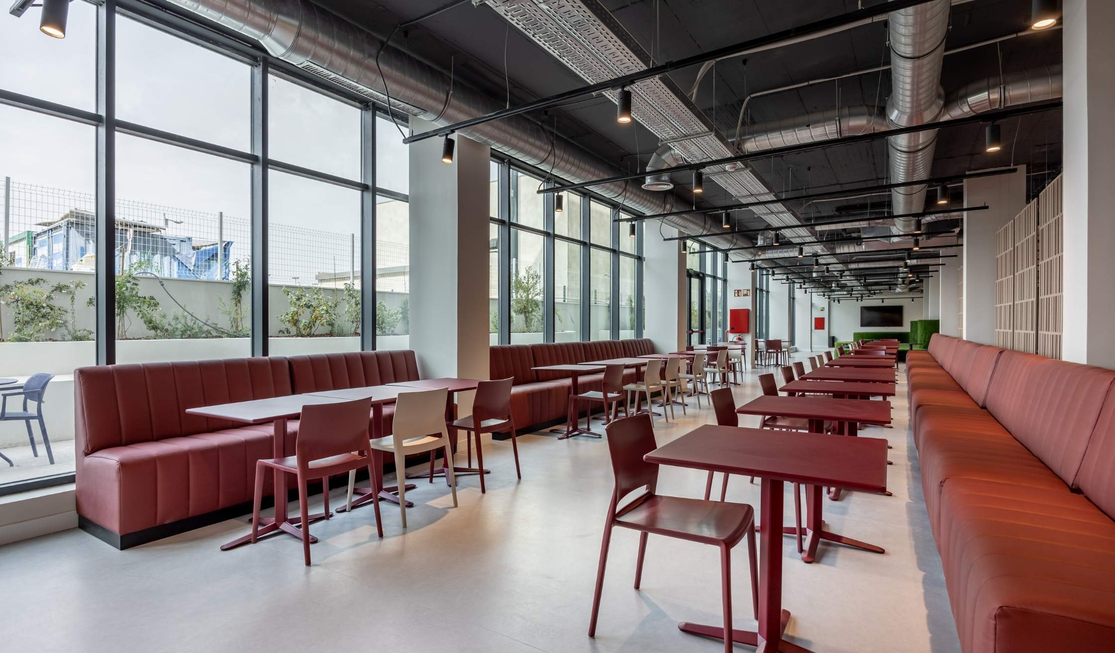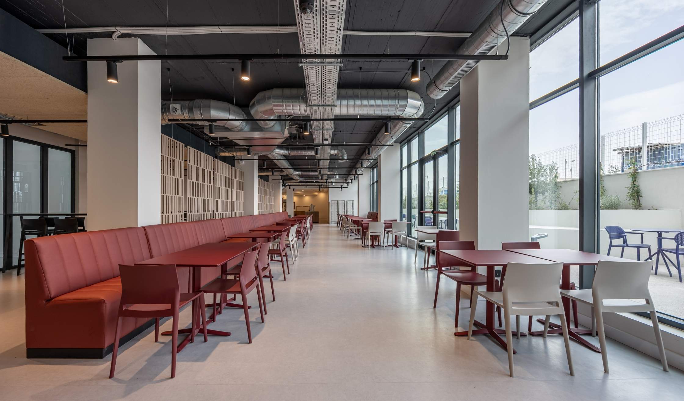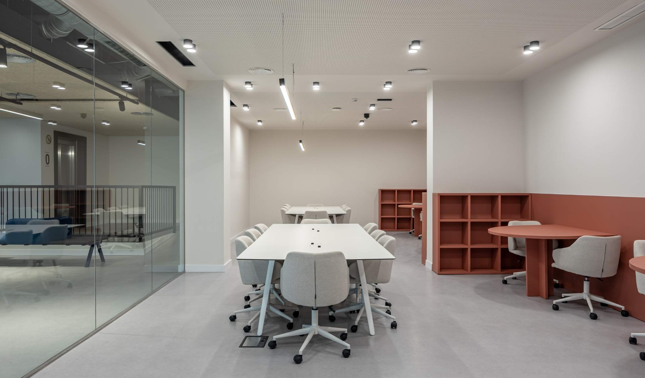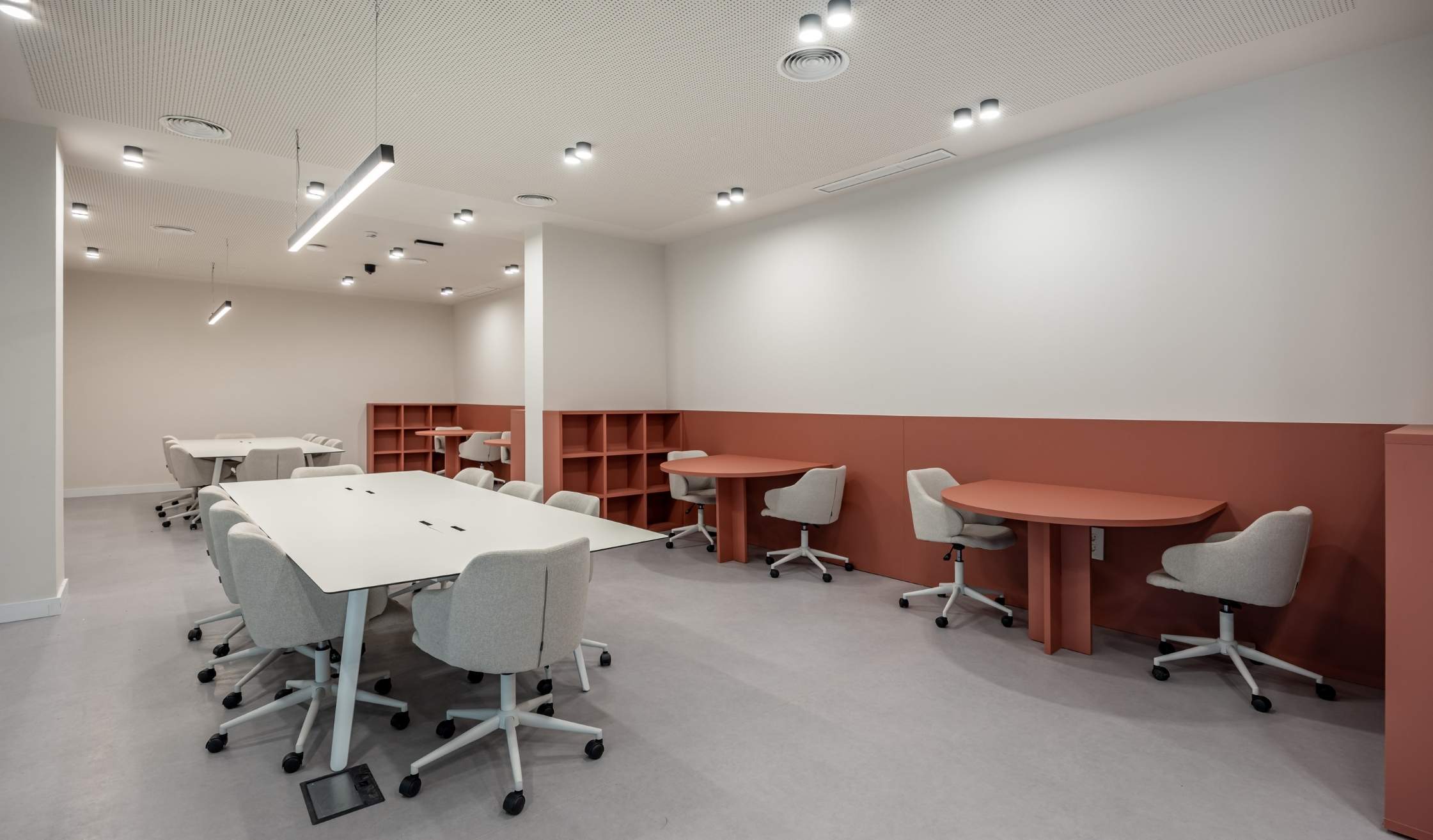En las zonas comunes, el mobiliario a medida consiste en la fabricación de elementos para la zona de biblioteca y salas de estudio, destacando la celosía a medida con propiedades acústicas.