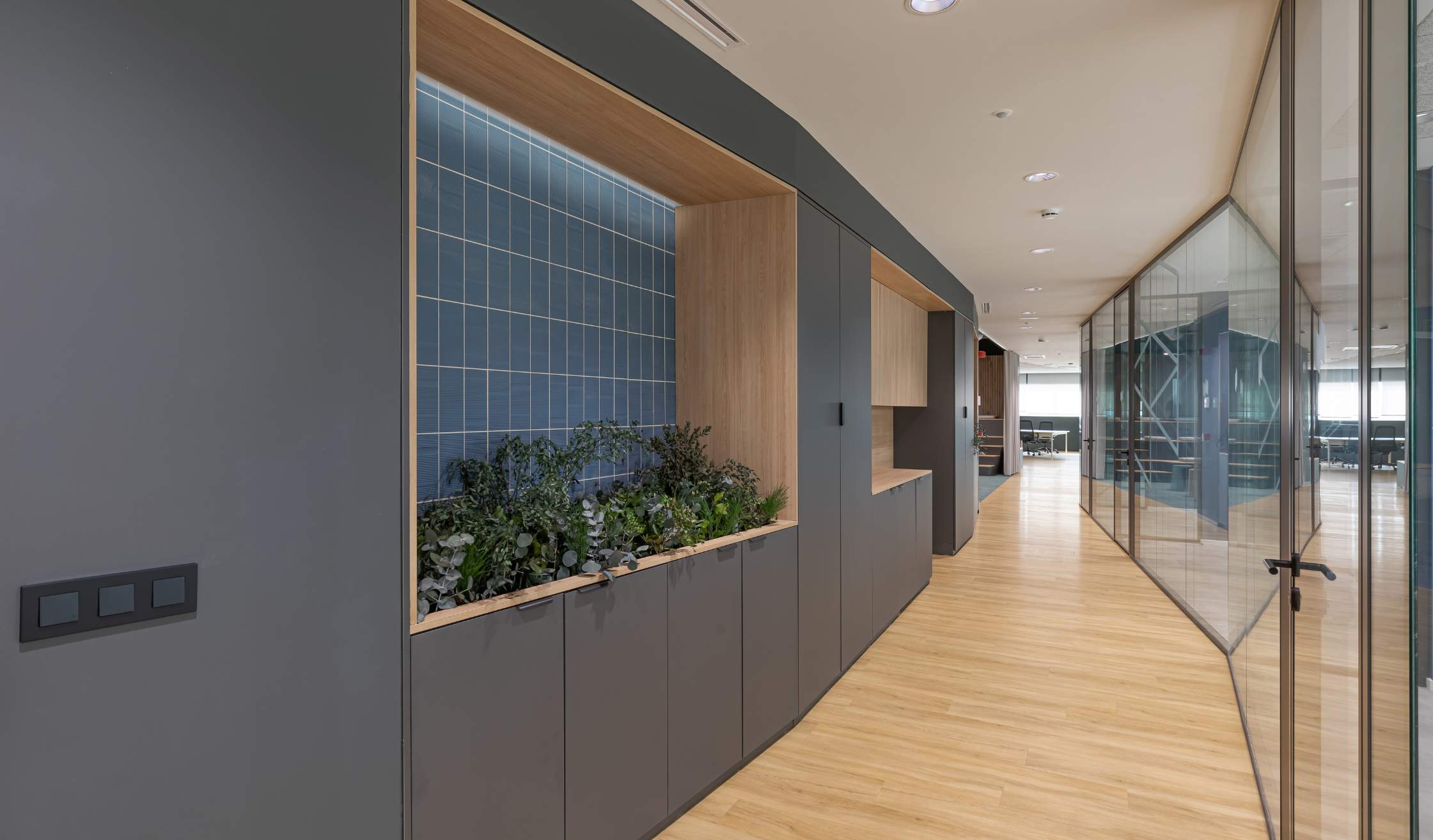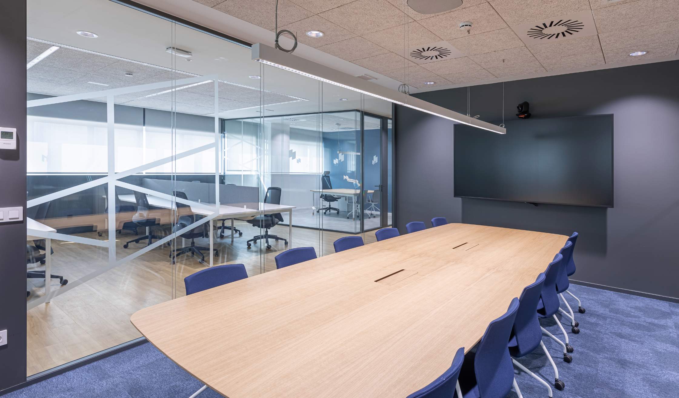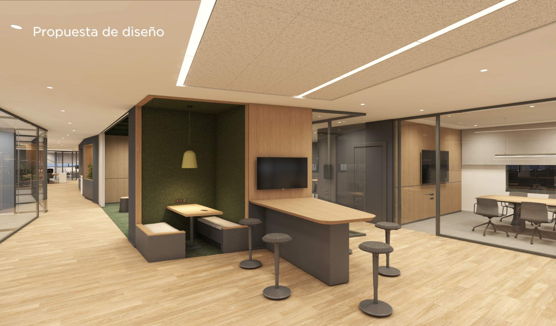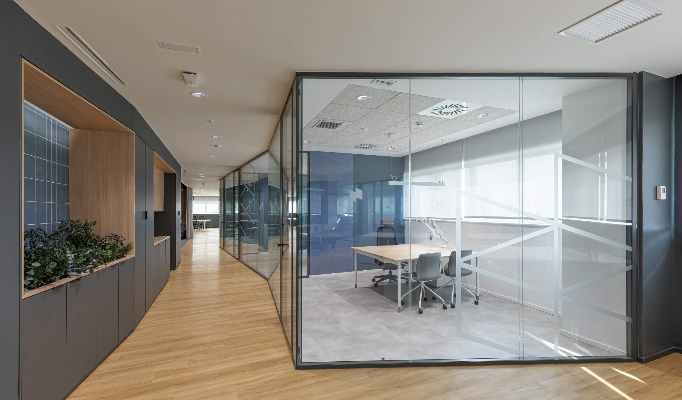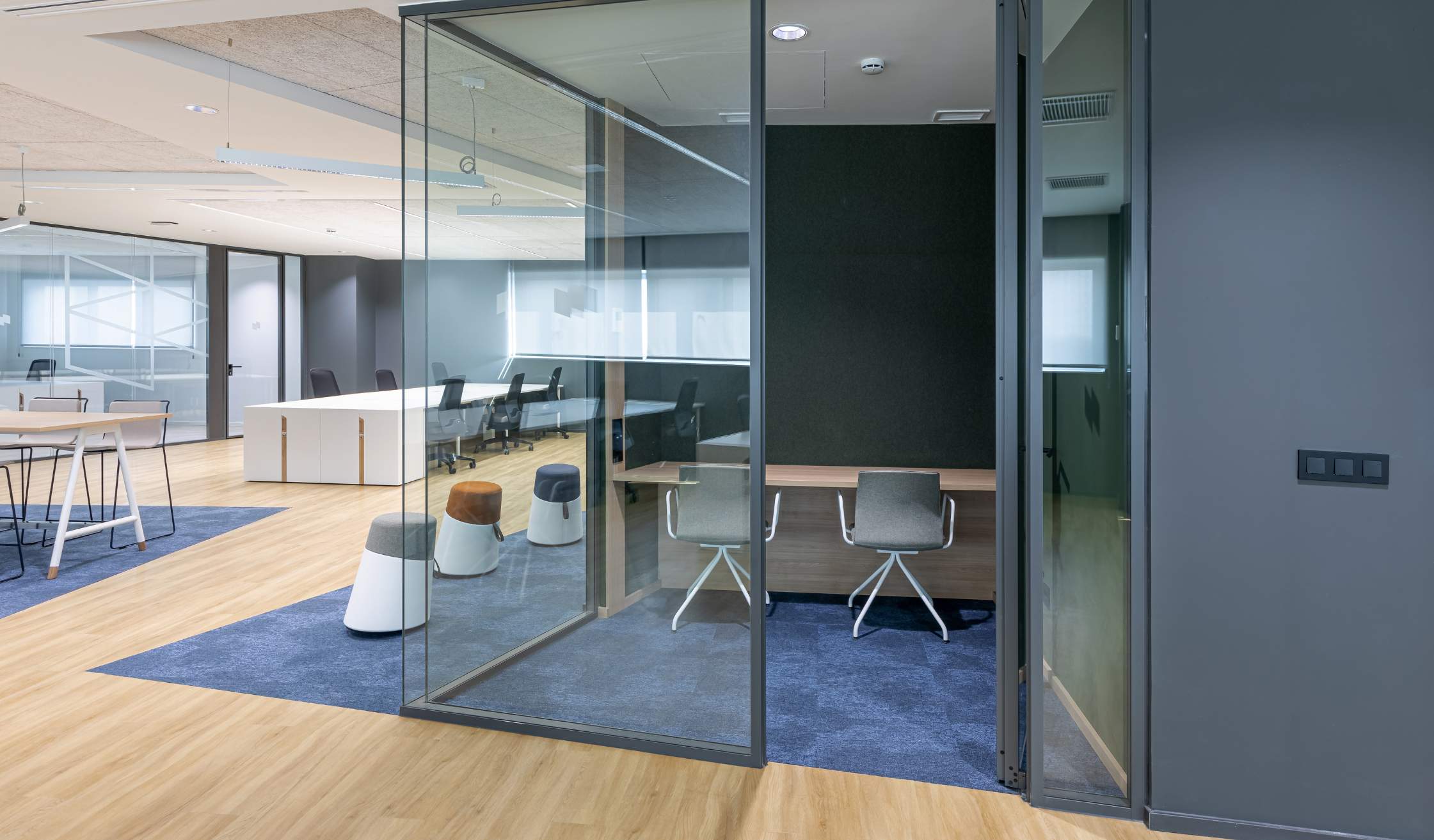 - Además, se completó el espacio con elementos originales, como paneles acústicos, mamparas dobles para mayor privacidad, pizarras de vidrio lacado y vegetación integrada, aportando frescura y calidez.