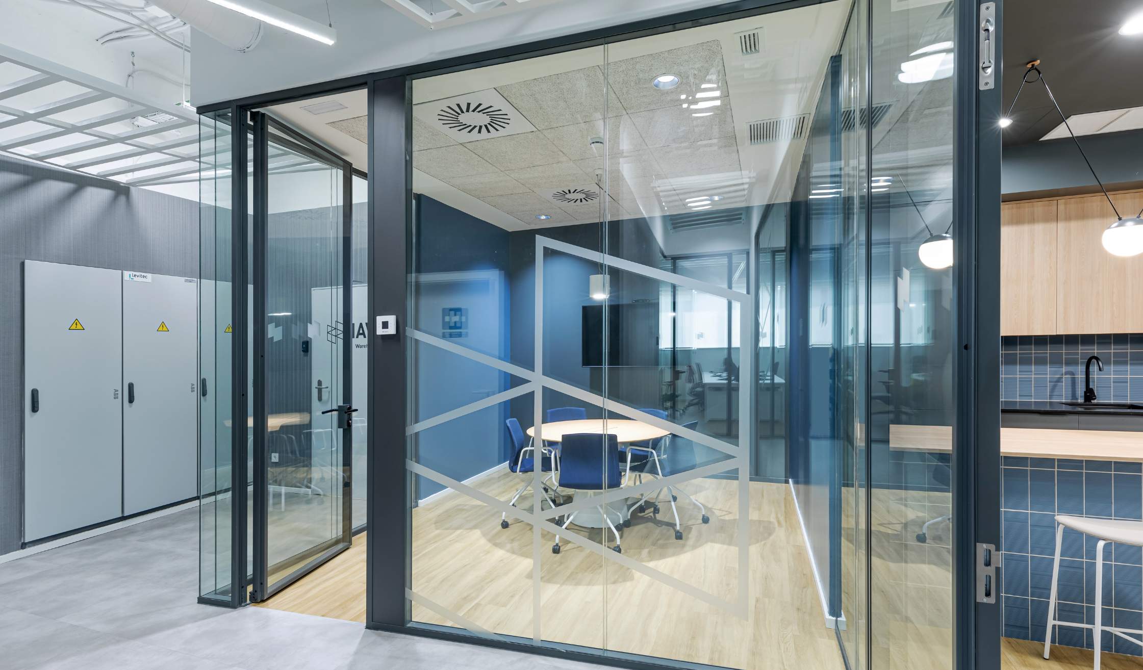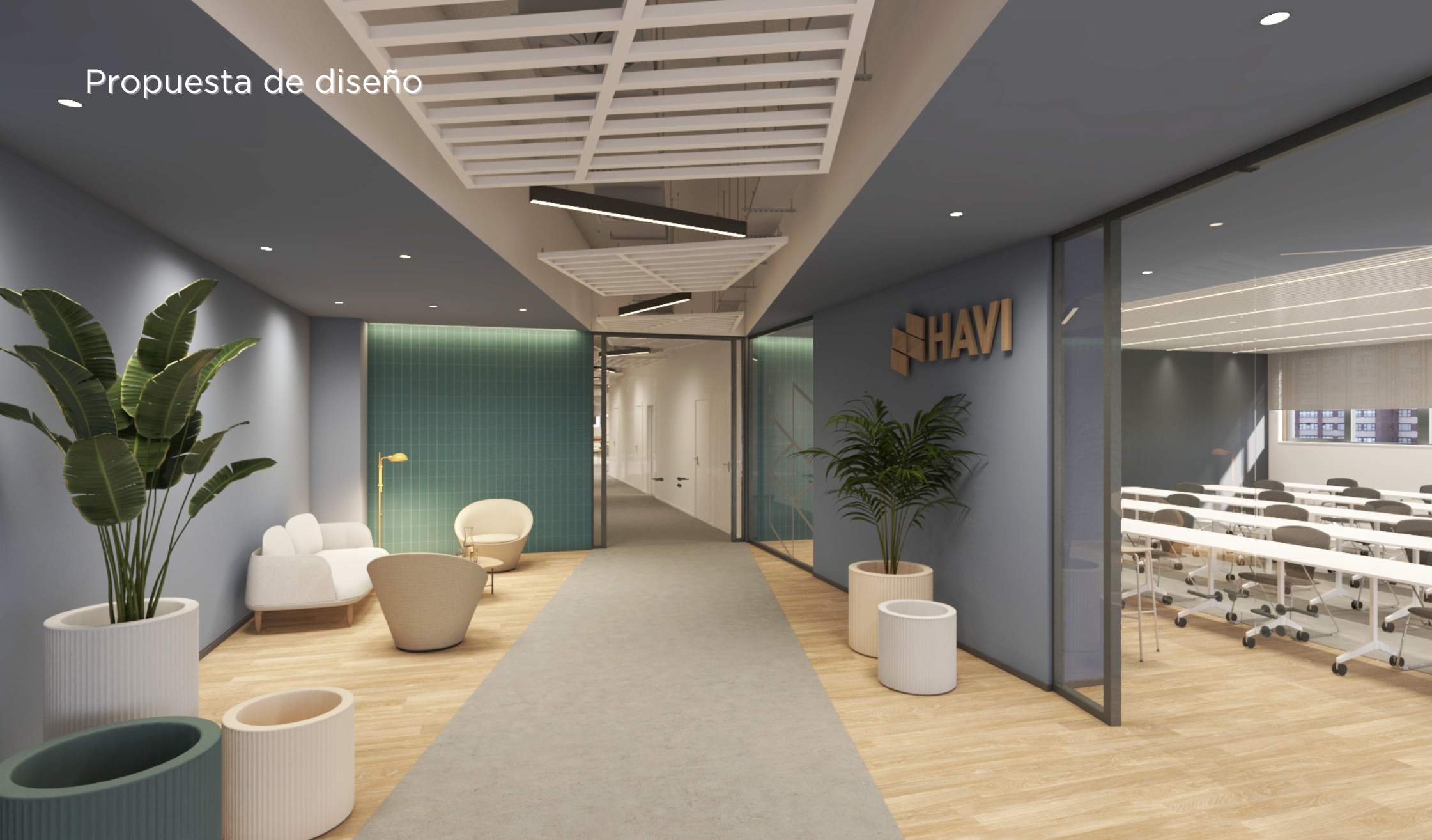 Por otro lado, la identidad corporativa de HAVI Spain se trasladó al espacio a través de vinilos en mamparas, señalética en escaleras y accesos, así como rótulos integrados que aportan coherencia visual al entorno. La reinterpretación de los colores corporativos en tonos azules y verdes, aplicados en elementos acústicos, suelos y mobiliario, aporta frescura y un sello propio al diseño final.