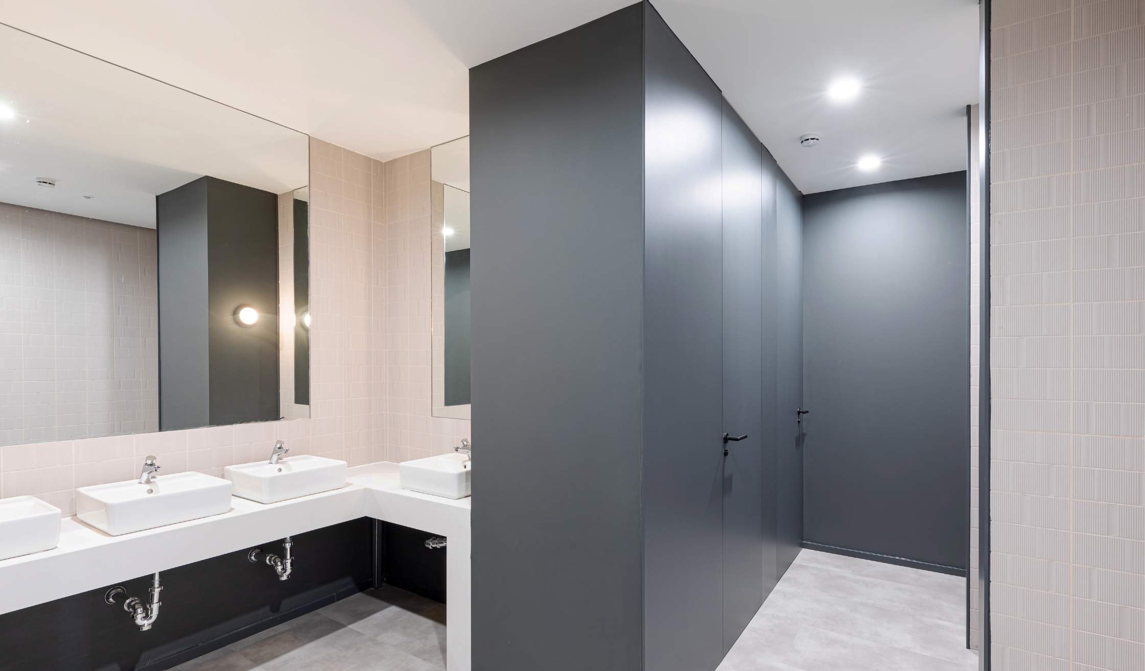 - En los aseos se aplicaron soluciones de calidad como panelados de DM lacado, puertas enrasadas y encimeras en solid surface, así como adaptación y accesibilidad PMR.