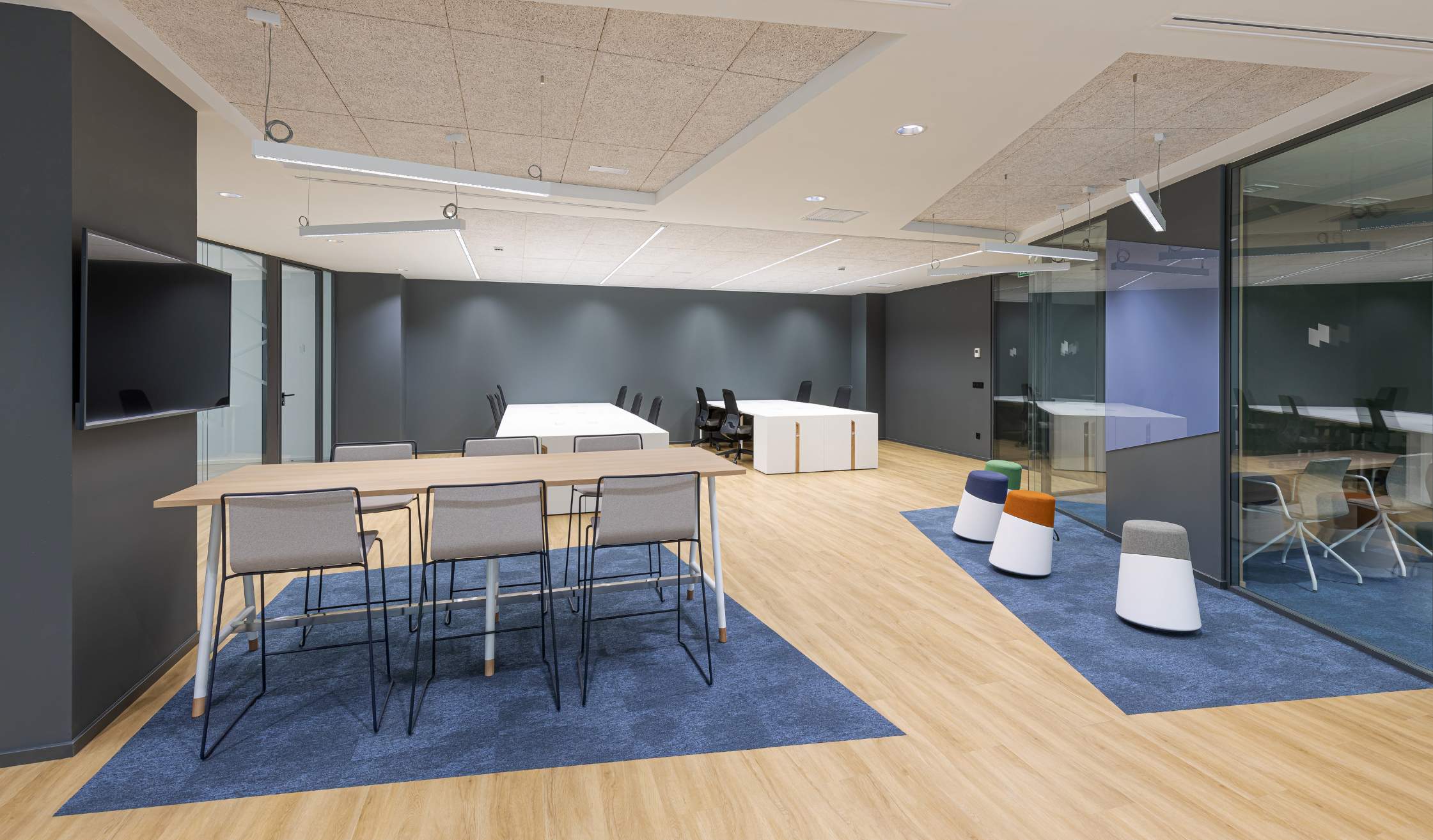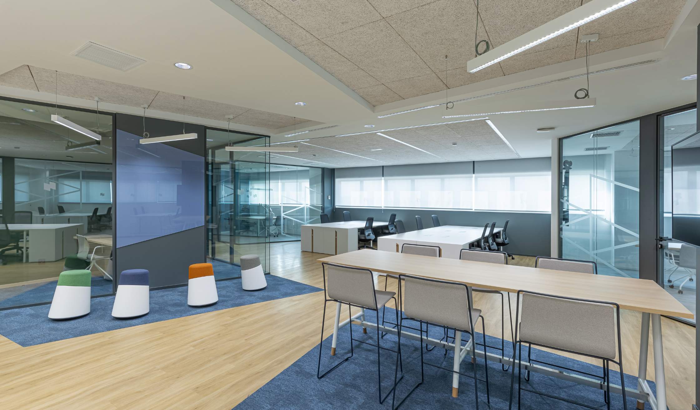 - En las áreas privadas, como despachos o salas de reuniones, se empleó pavimento de PVC gris combinado con mobiliario de madera y techos registrables de viruta, generando contrastes que definen los espacios de manera funcional y estética. Entre otro mobiliario, se suministran mesas, sillas, piezas de almacenaje, taburetes…