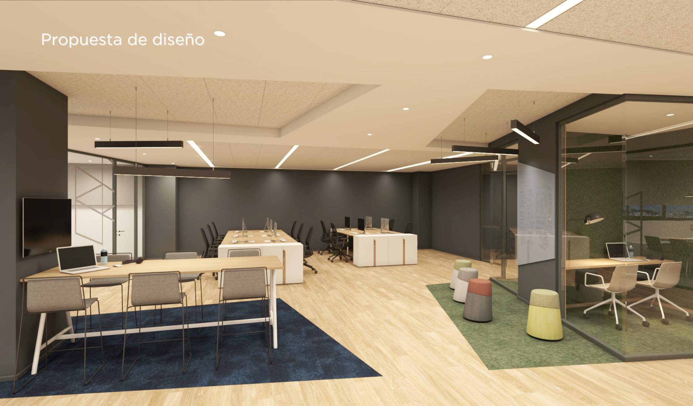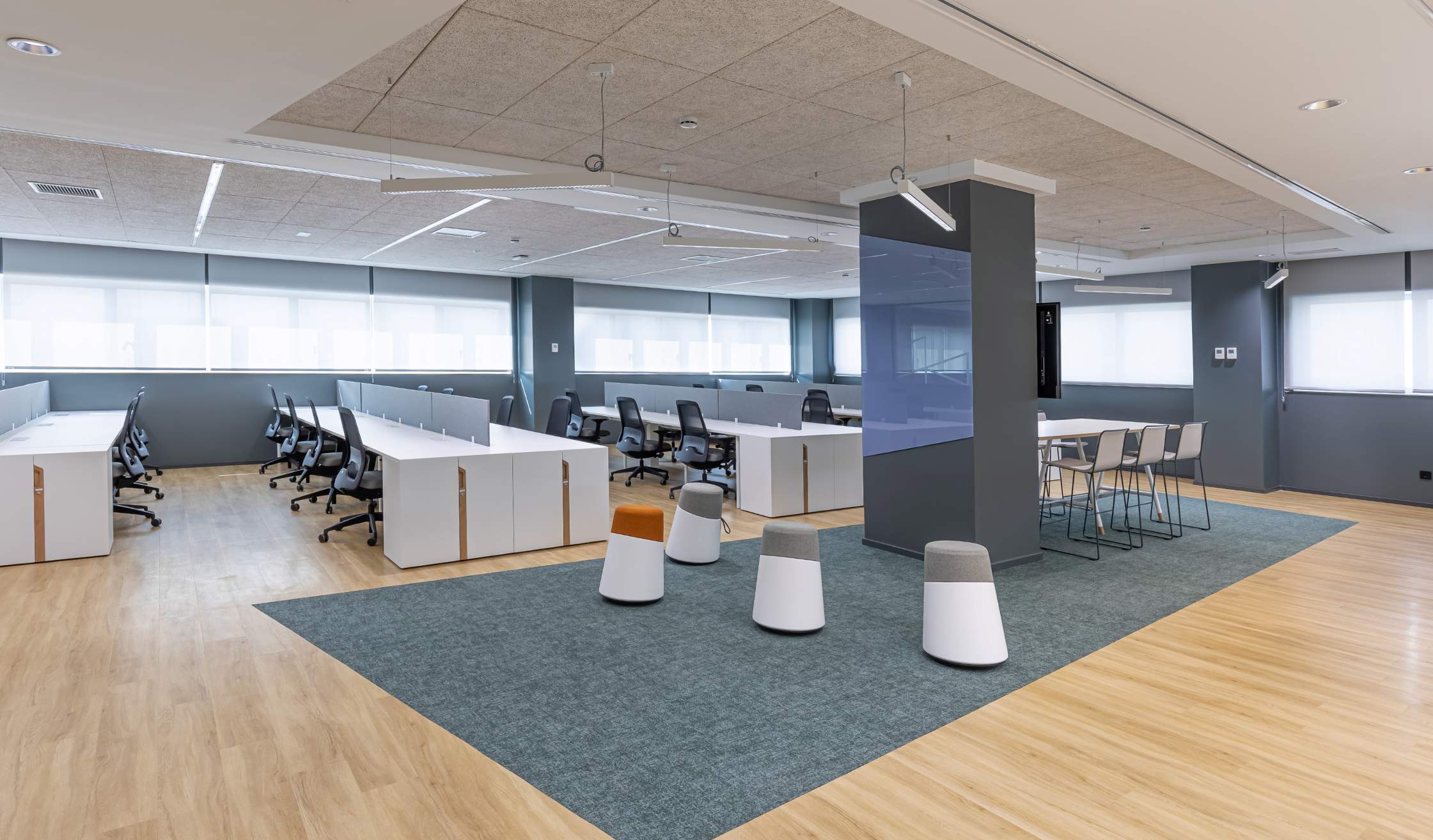 - En las zonas de trabajo open space predominan los suelos de madera con mobiliario en tonos blancos y techos continuos de pladur. Puestos operativos, mesas, sillas, taburetes, soft seating… Se suministran las piezas necesarias para un día a día cómodo.