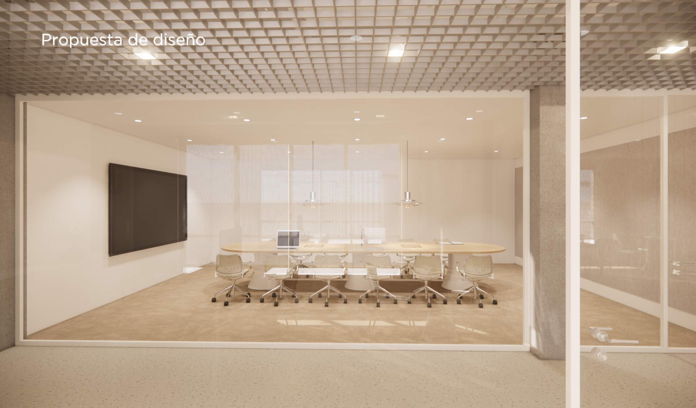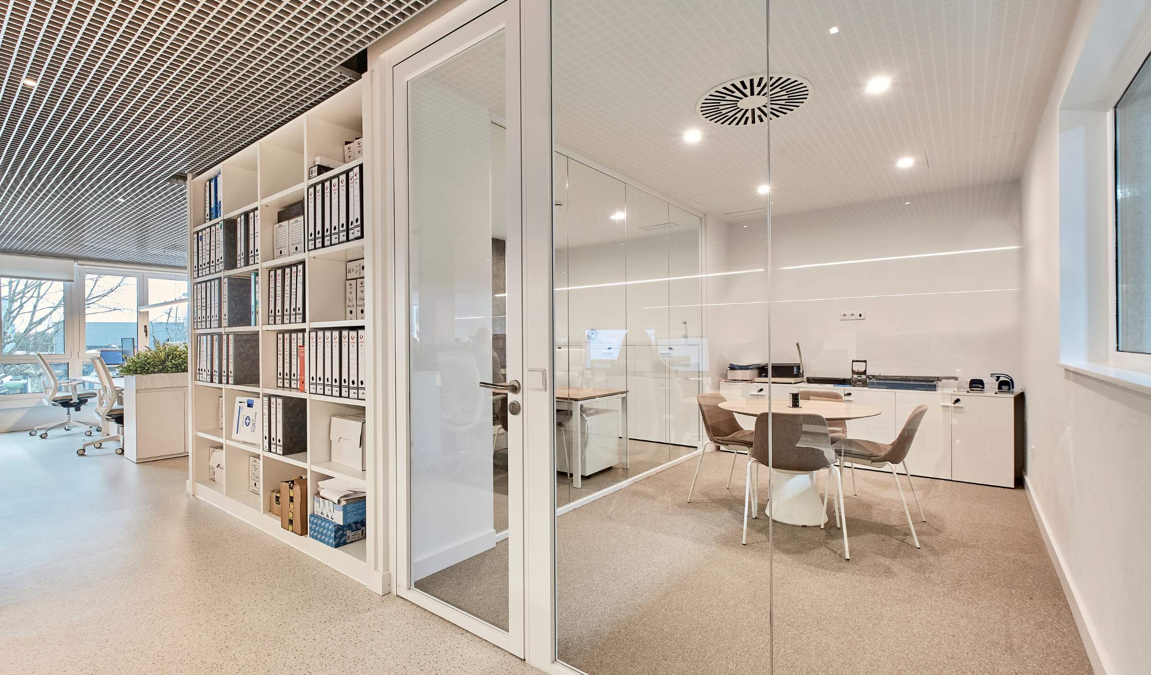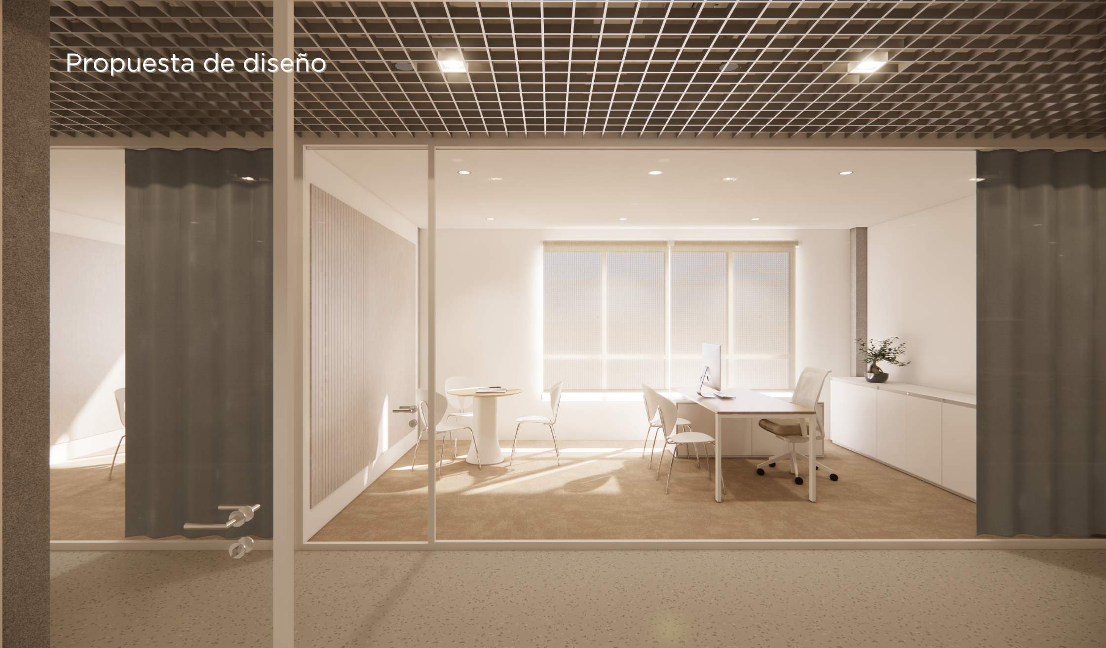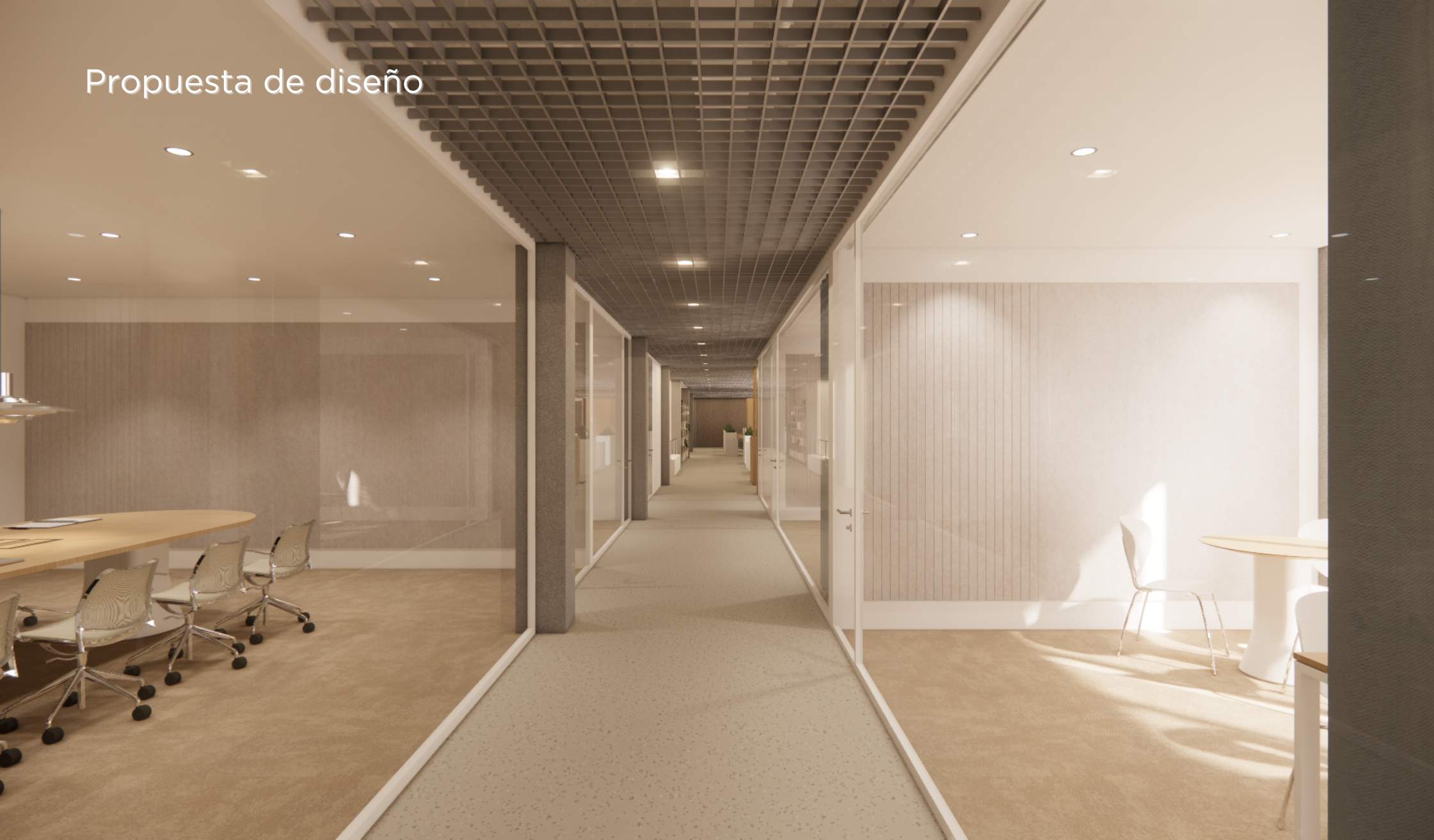 - Compartimentación con mamparas de vidrio para potenciar transparencia y continuidad visual.