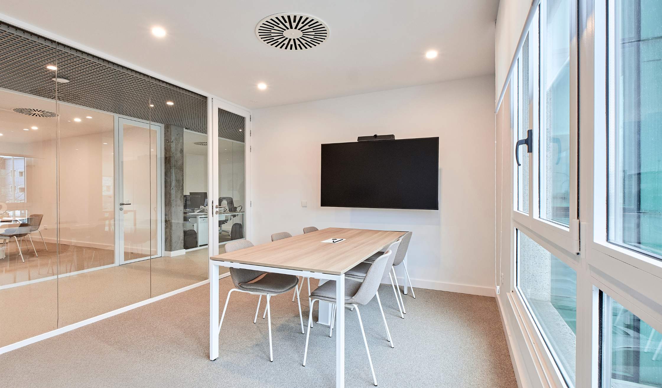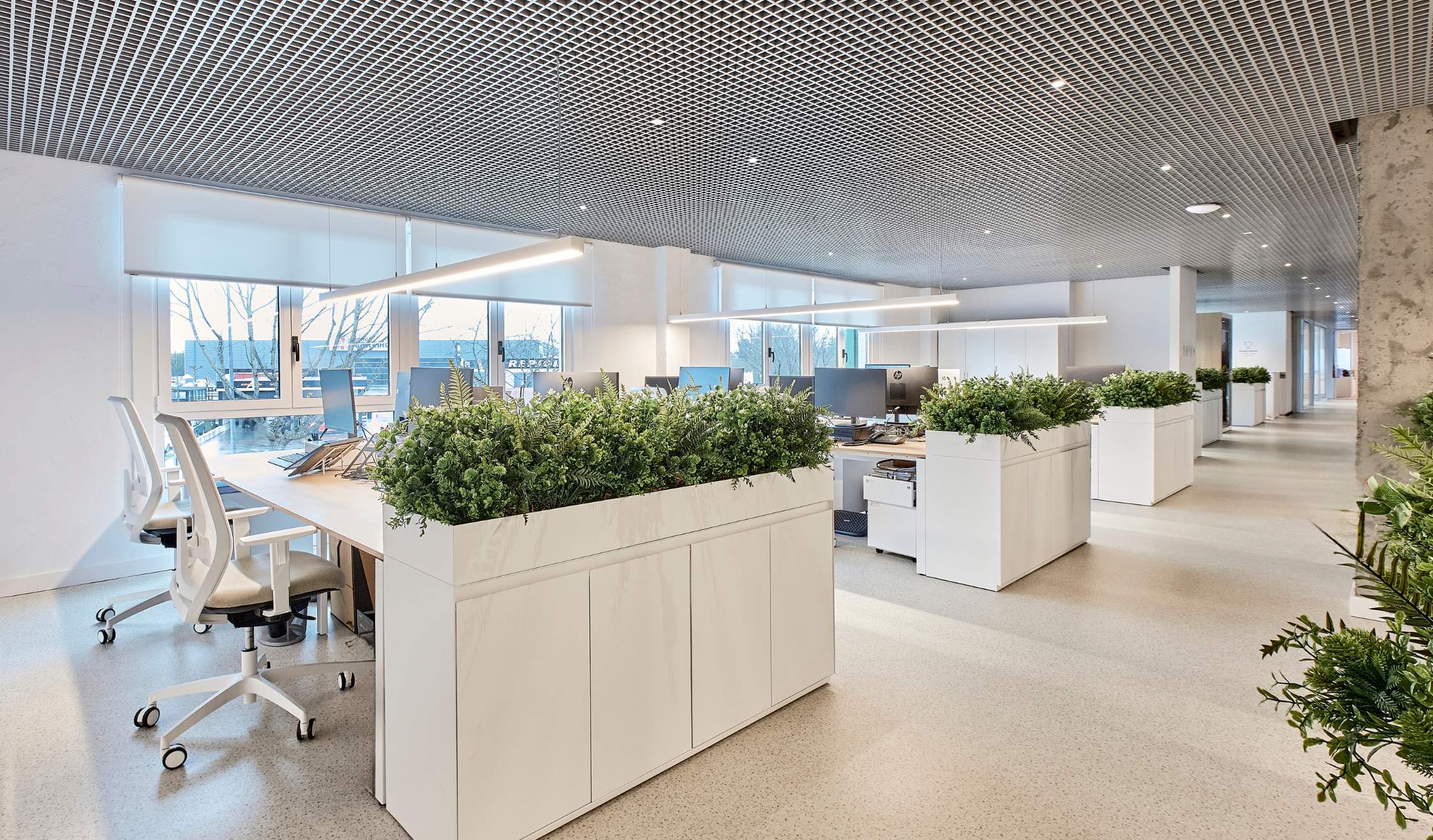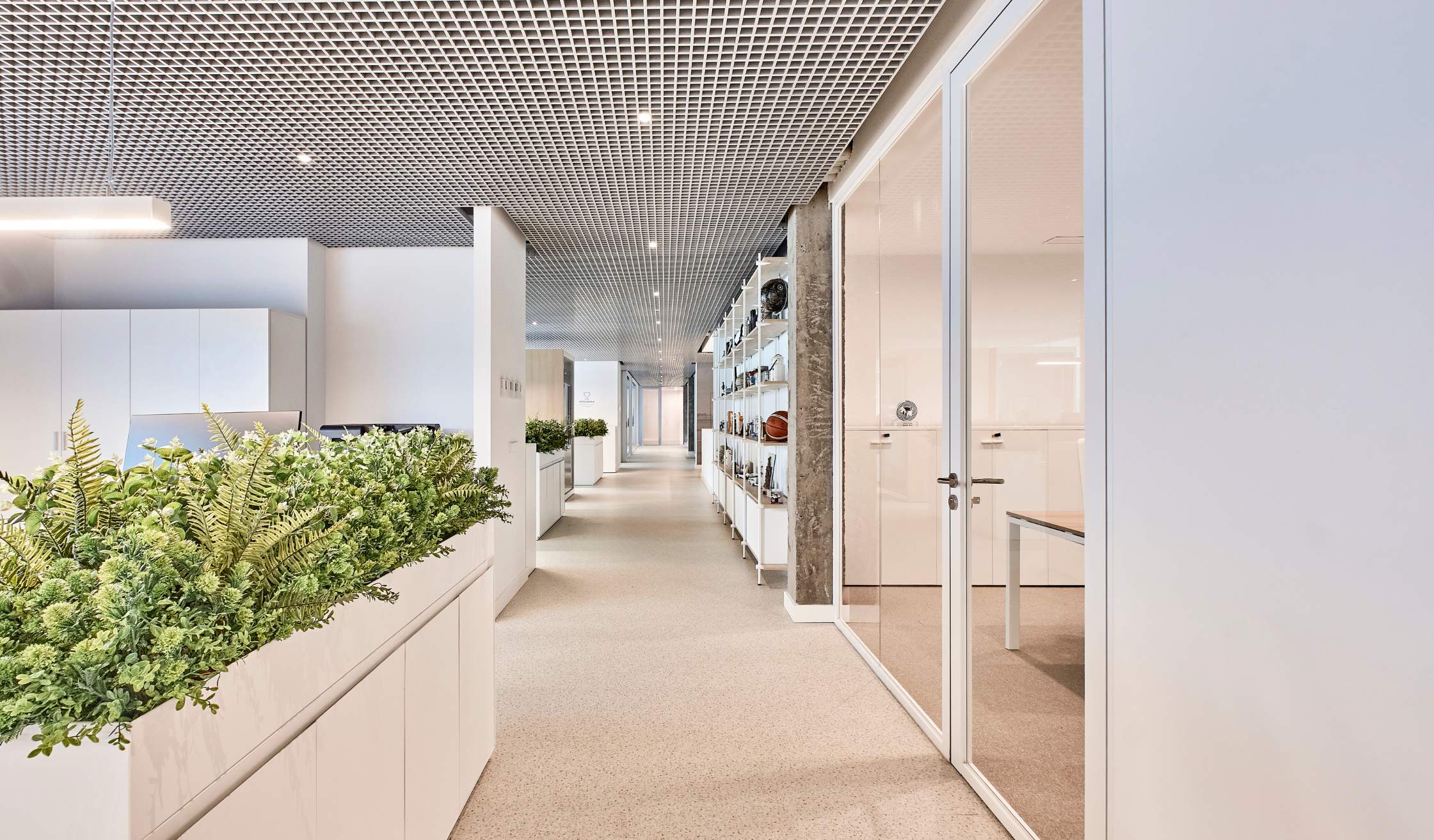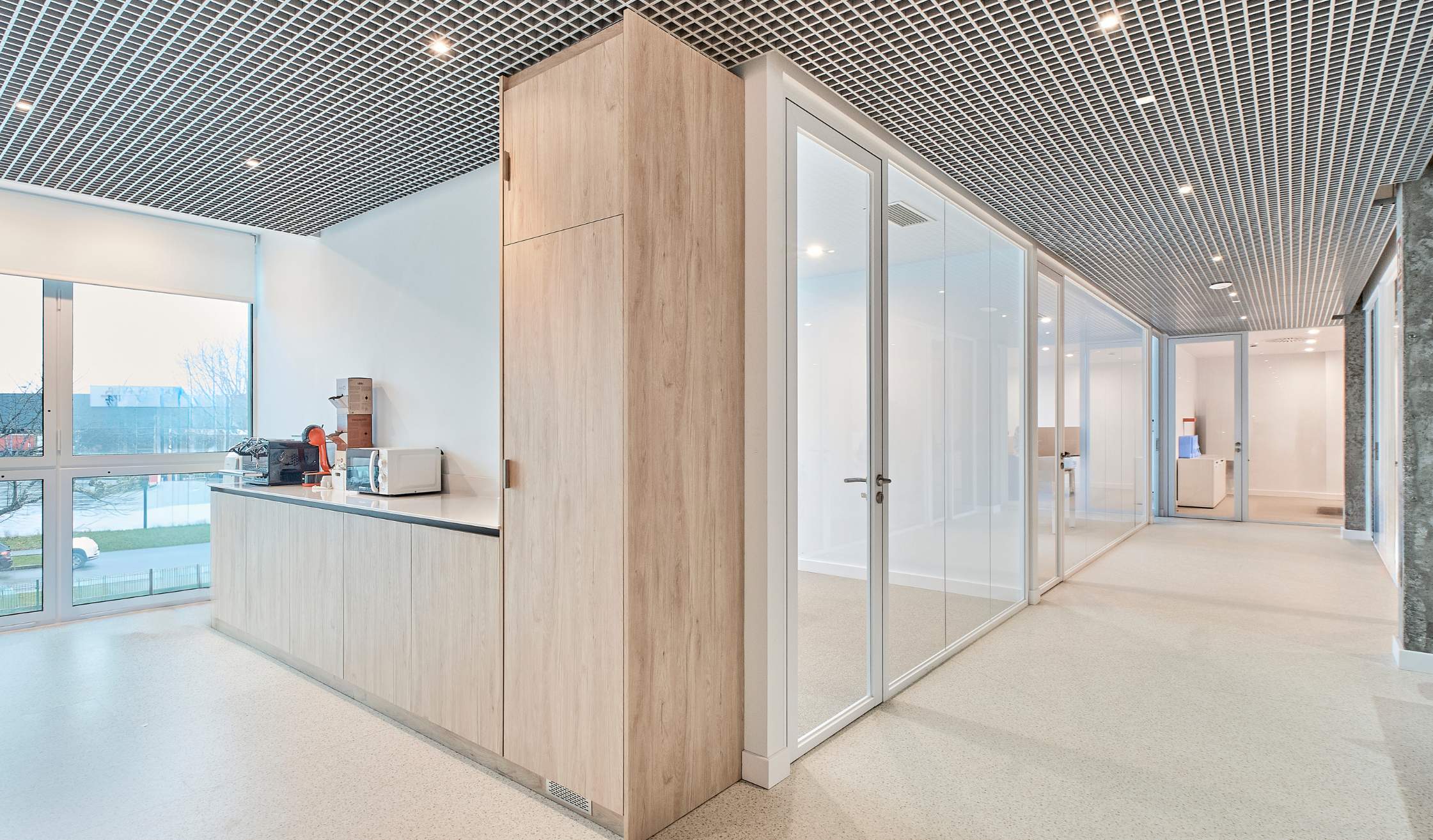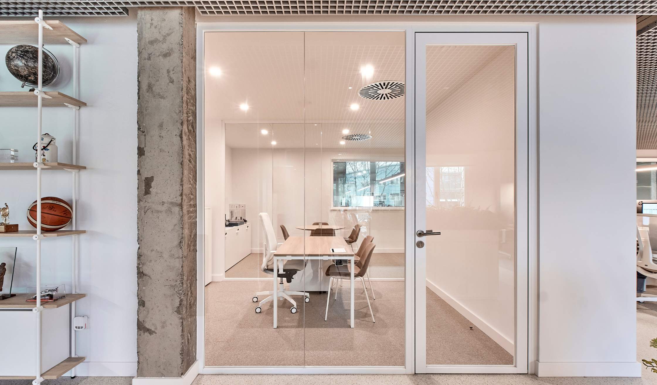 - Compartimentación con mamparas de vidrio para potenciar transparencia y continuidad visual.