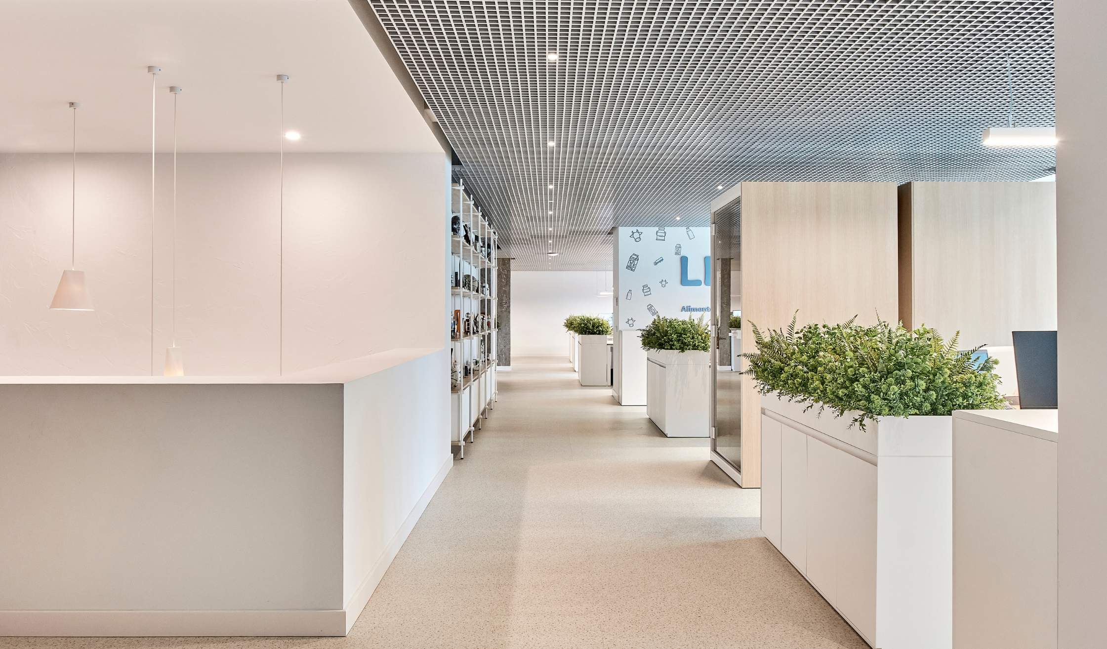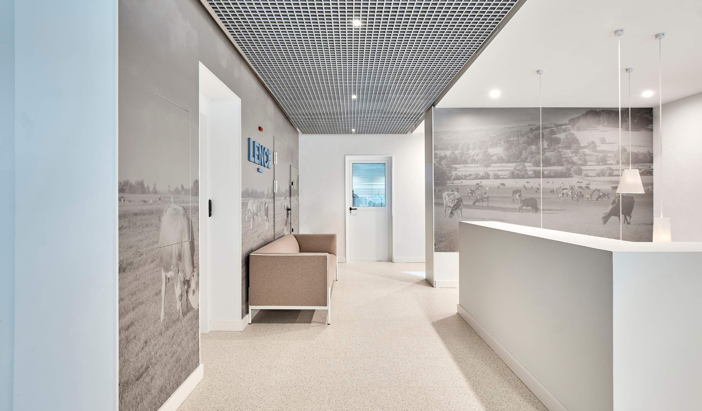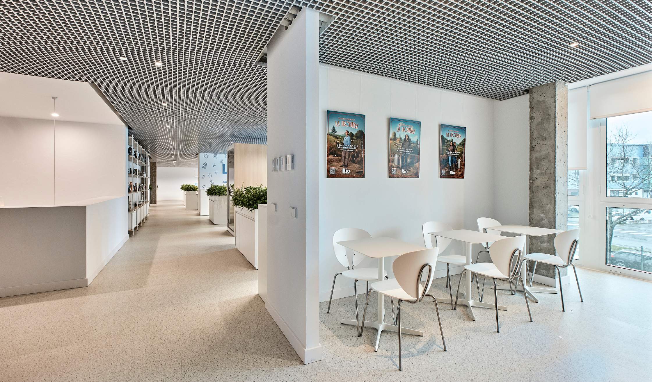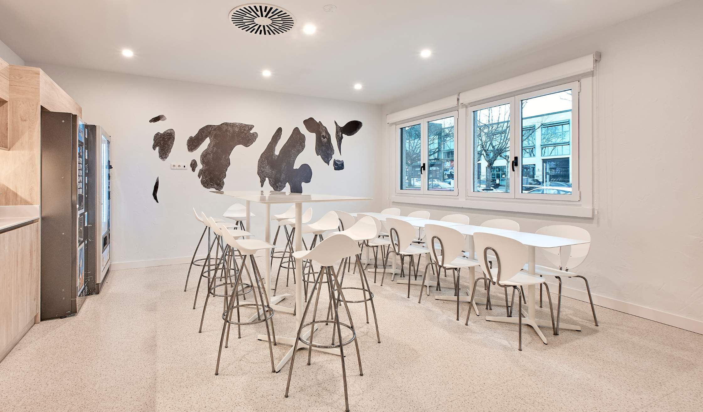 La inspiración en la materia prima del grupo, la leche, se traslada al diseño interior mediante superficies claras, texturas orgánicas y detalles formales que evocan fluidez y pureza.