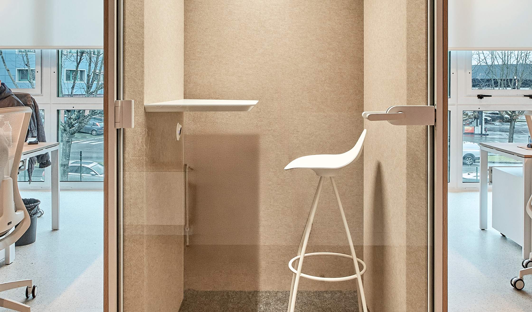 Para complementar los diferentes ambientes, la Oficina Técnica de Mobiliario selecciona soluciones que combinan ergonomía, flexibilidad y continuidad visual: mesas electrificadas, mamparas, phone booths, sillas operativas, taburetes, estores, sofás, estanterías de gran formato y vegetación.