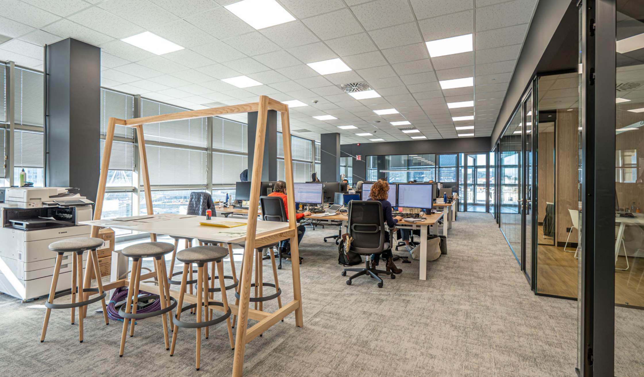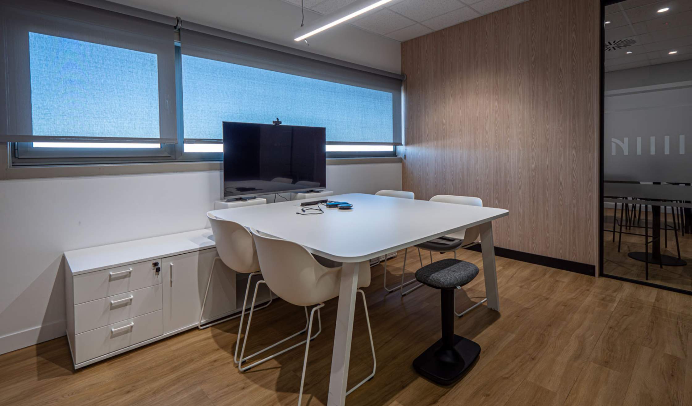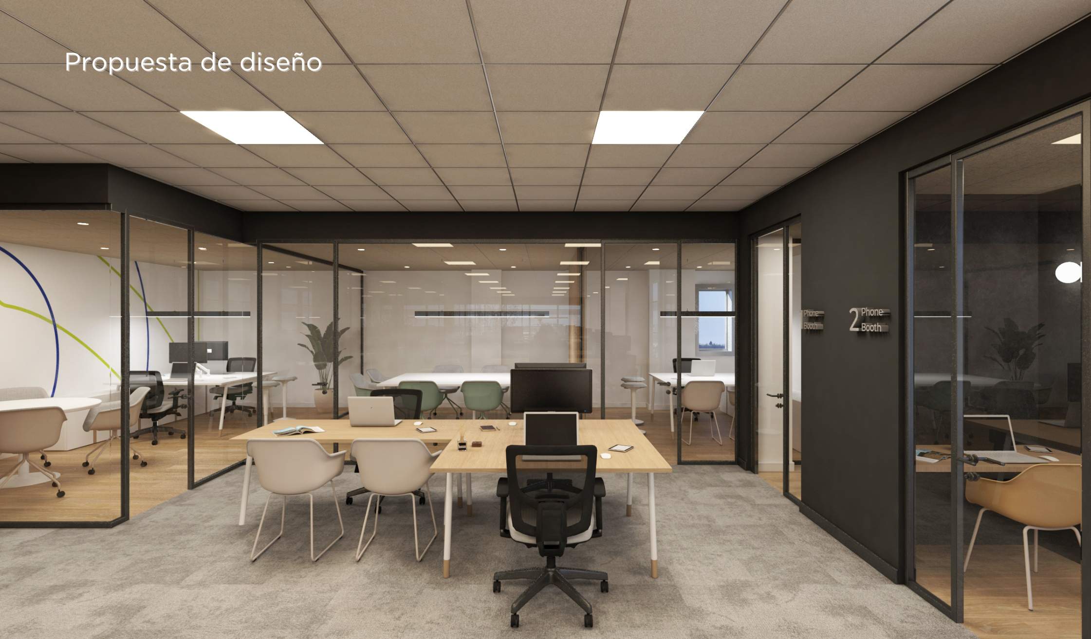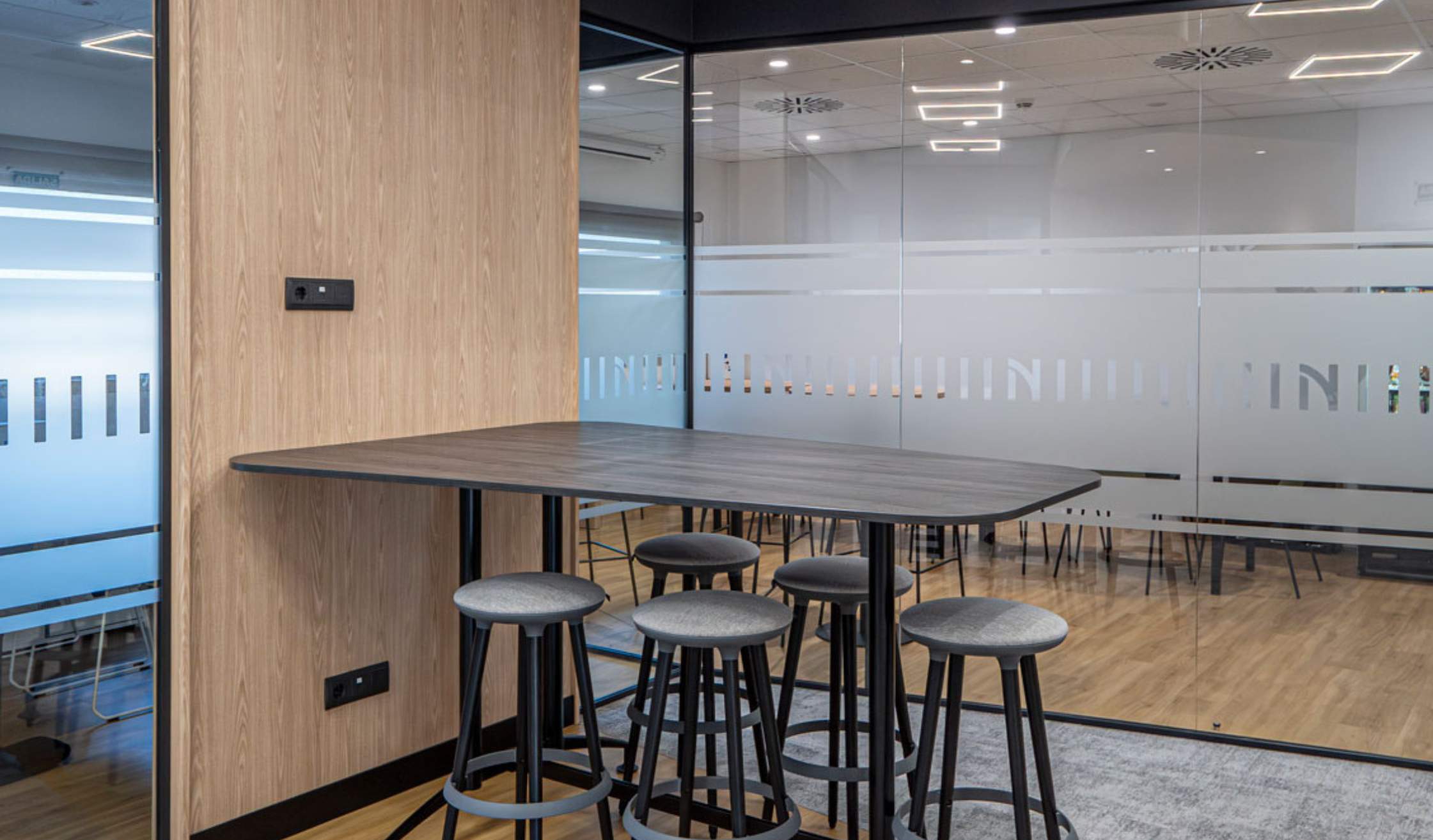 - Equipamiento integral: en los talleres propios del grupo se dan vida a piezas a medida que trasladan el diseño a la realidad, como mesas, mobiliario auxiliar, phone booths o panelados. Además, se seleccionan elementos de mobiliario para complementar el proyecto, como sillas y mesas operativas, mobiliario para el office o para la zona de entrada.