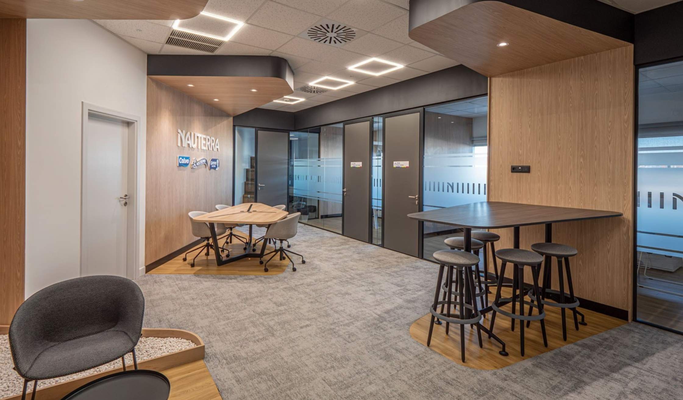 Gracias a la coordinación entre diseño, obra y equipamiento, cada rincón refleja la identidad corporativa de Nauterra y se convierte en un entorno funcional, flexible y acogedor.