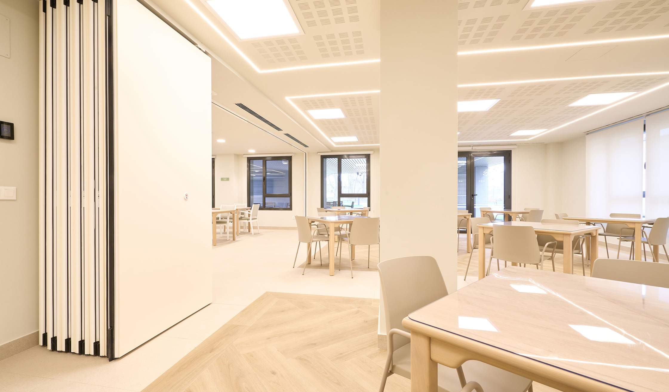 - Espacios comunes, como recepción, salas de convivencia, comedor, salas de estar, espacios polivalentes, cocinas comunes…