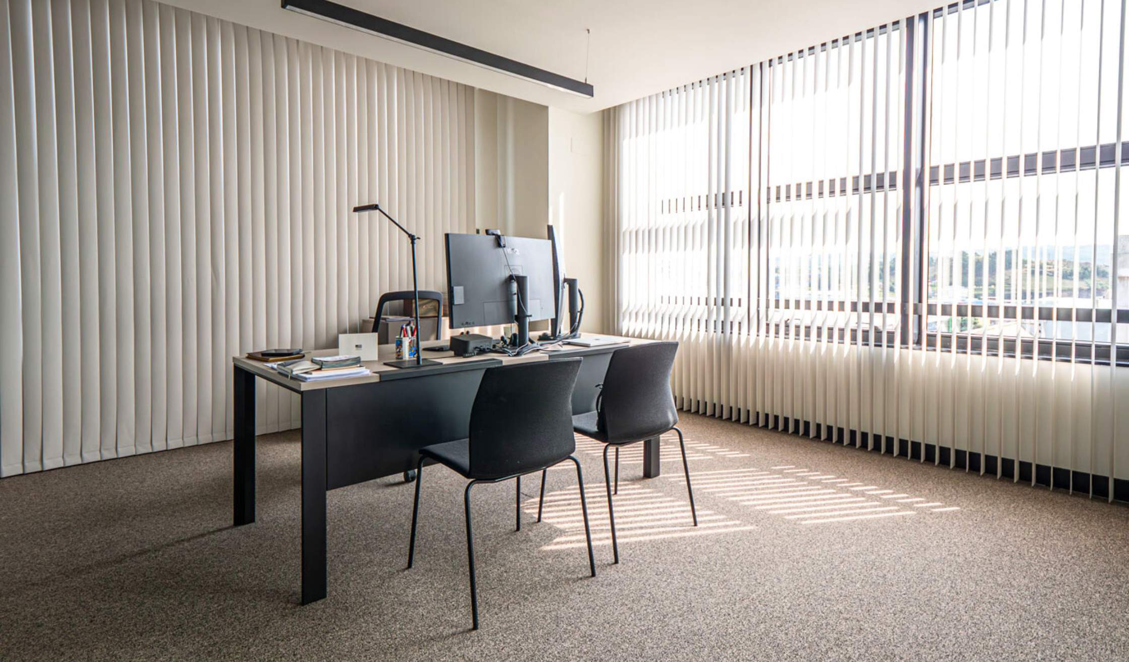 El espacio de trabajo se equipa con piezas de fabricantes de calidad, como puestos operativos, mesas de despachos, sillas auxiliares, mobiliario para zonas de reuniones, luminarias, laminados como cerramiento de ventanas…