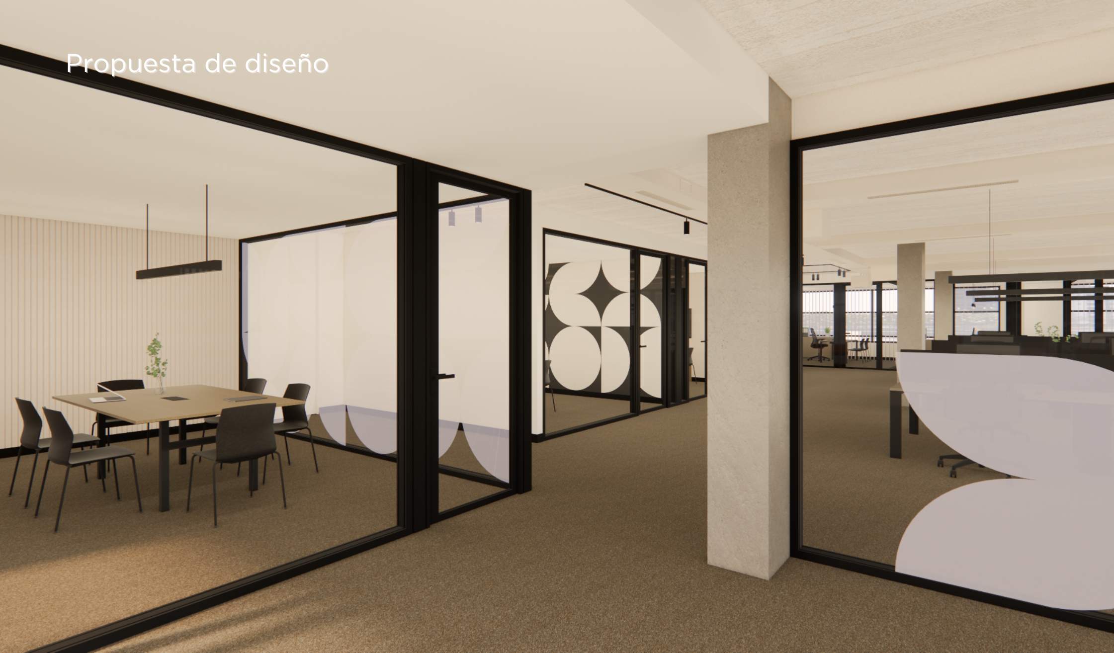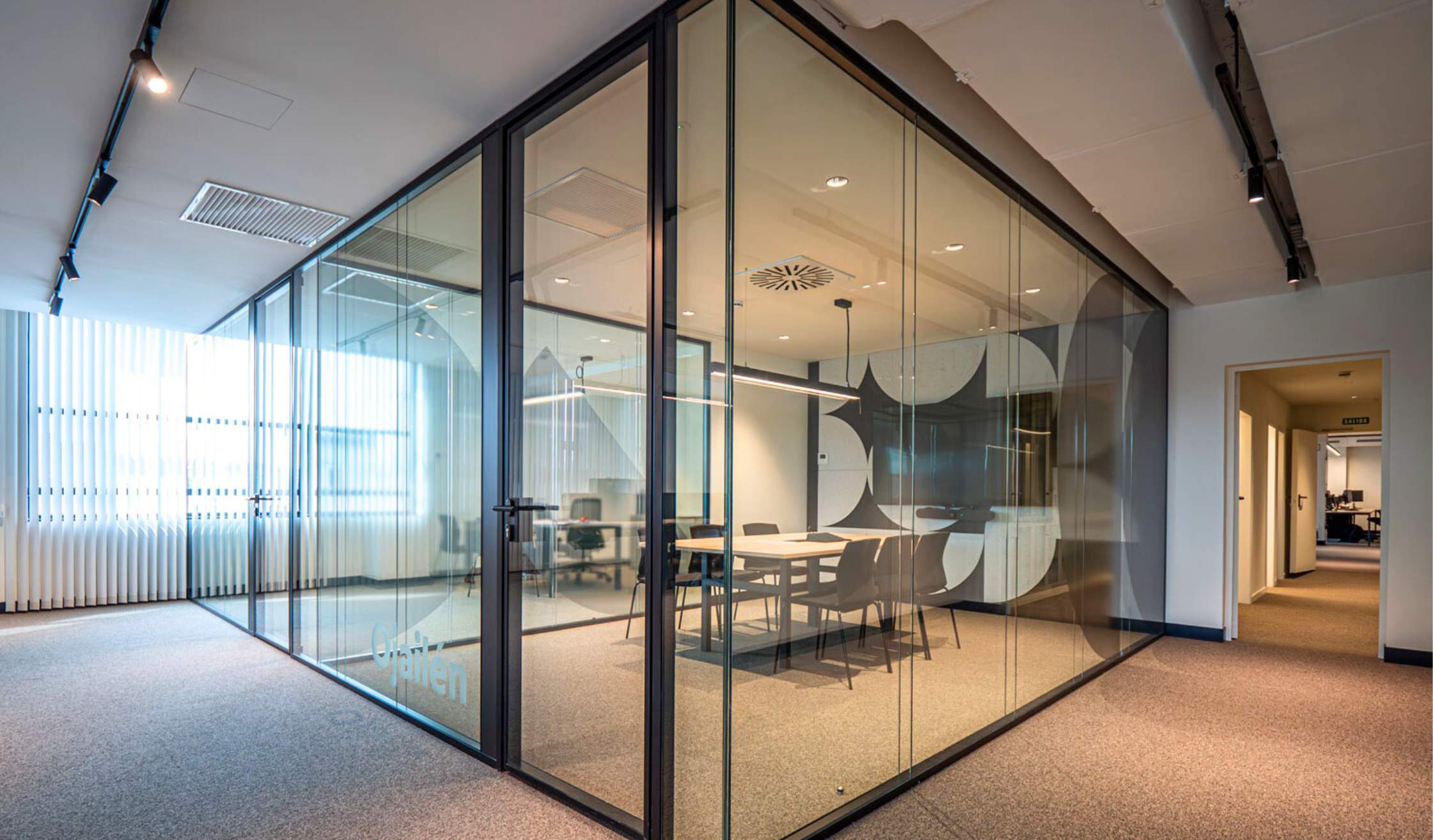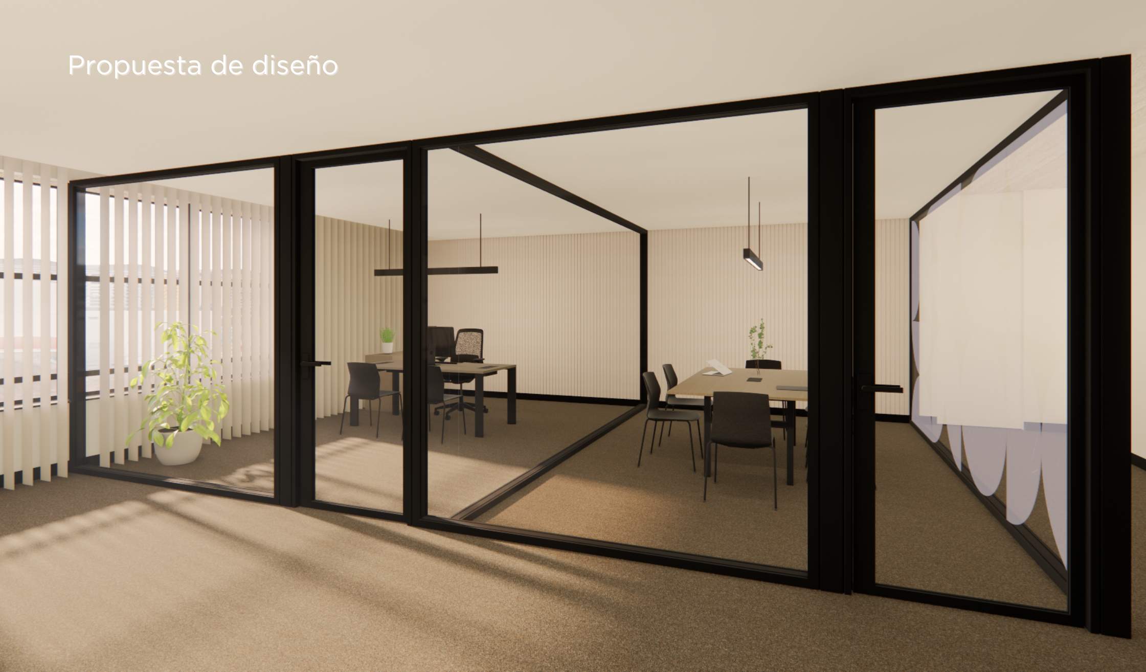 - Compartimentación mediante mamparas acristaladas, fabricadas en vidrio y con perfil de aluminio en negro.