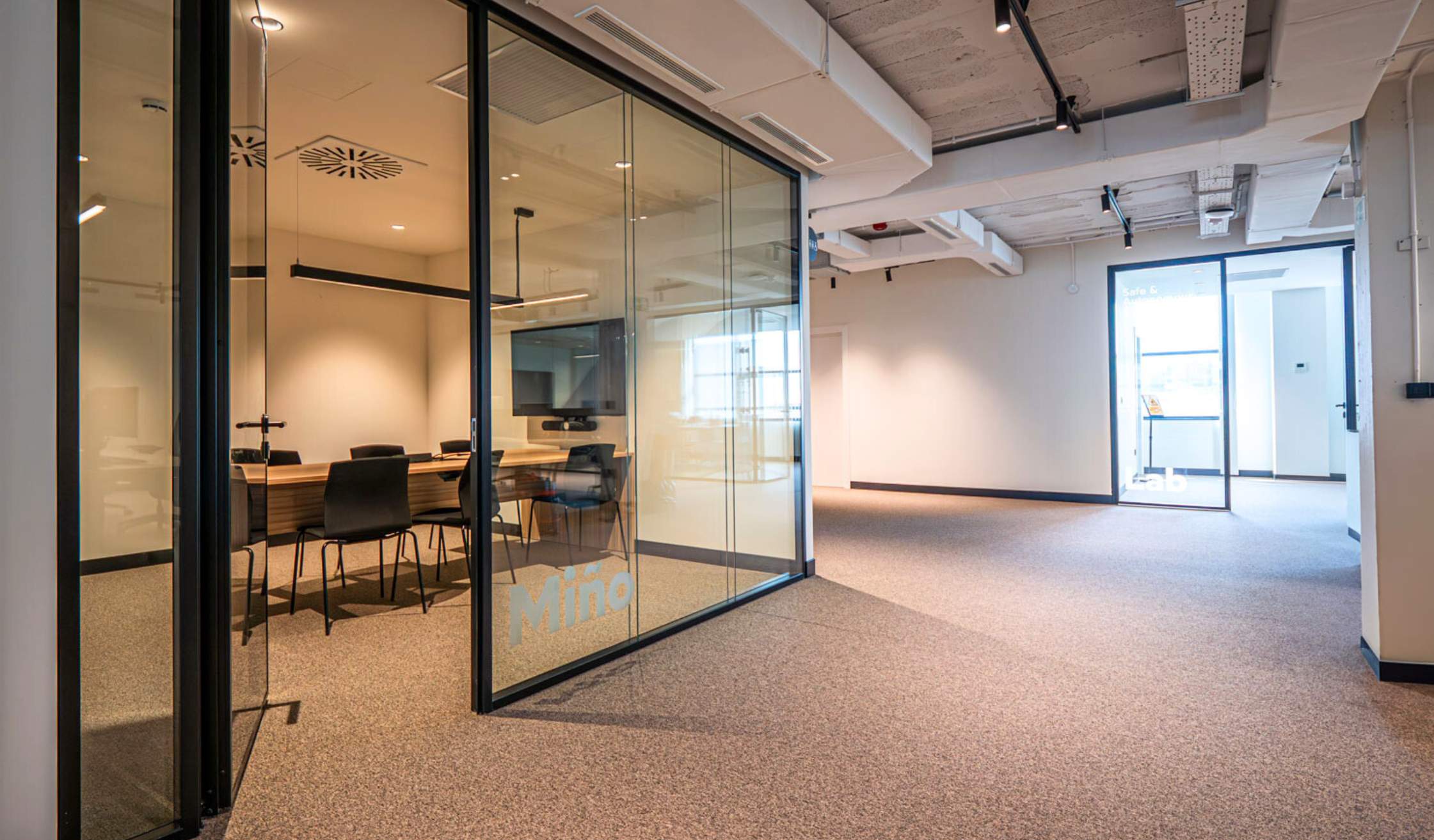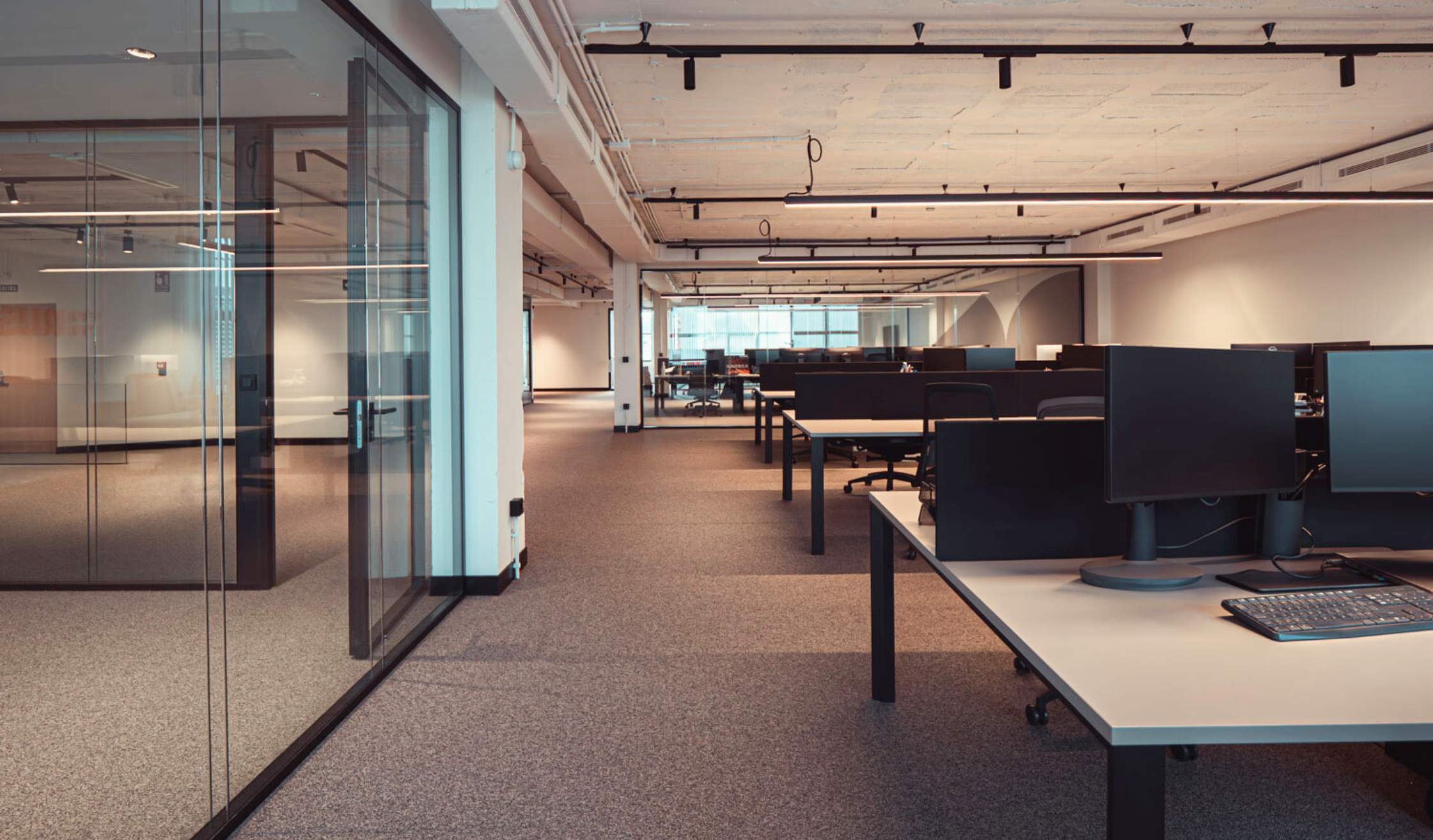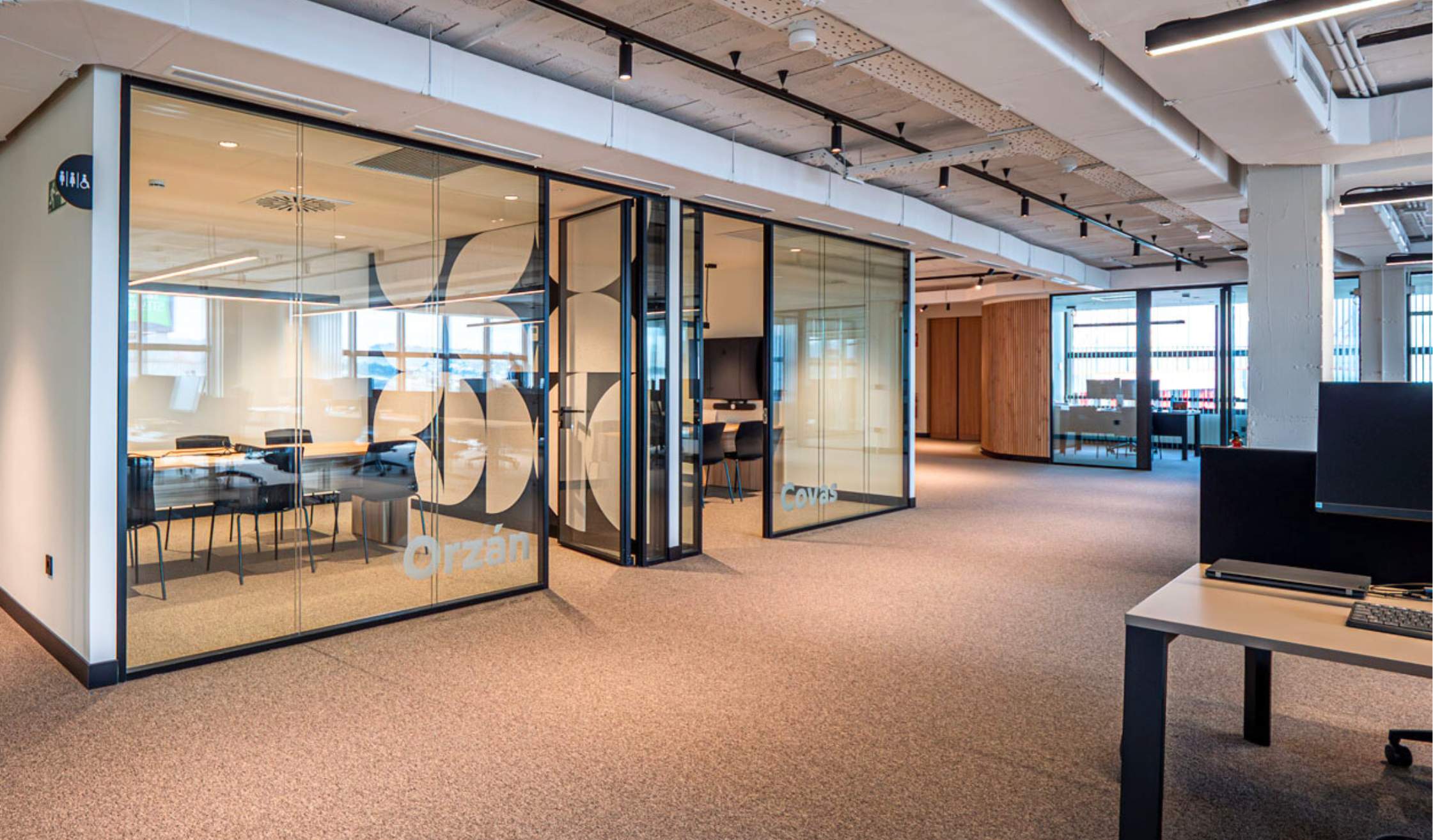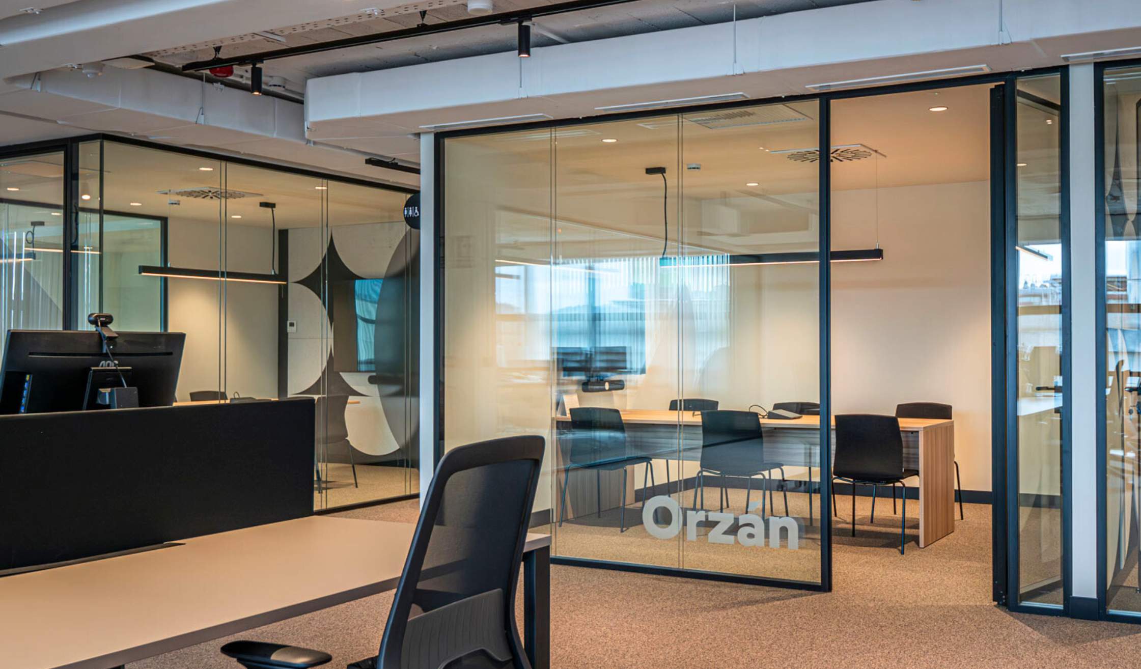 - Compartimentación mediante mamparas acristaladas, fabricadas en vidrio y con perfil de aluminio en negro.