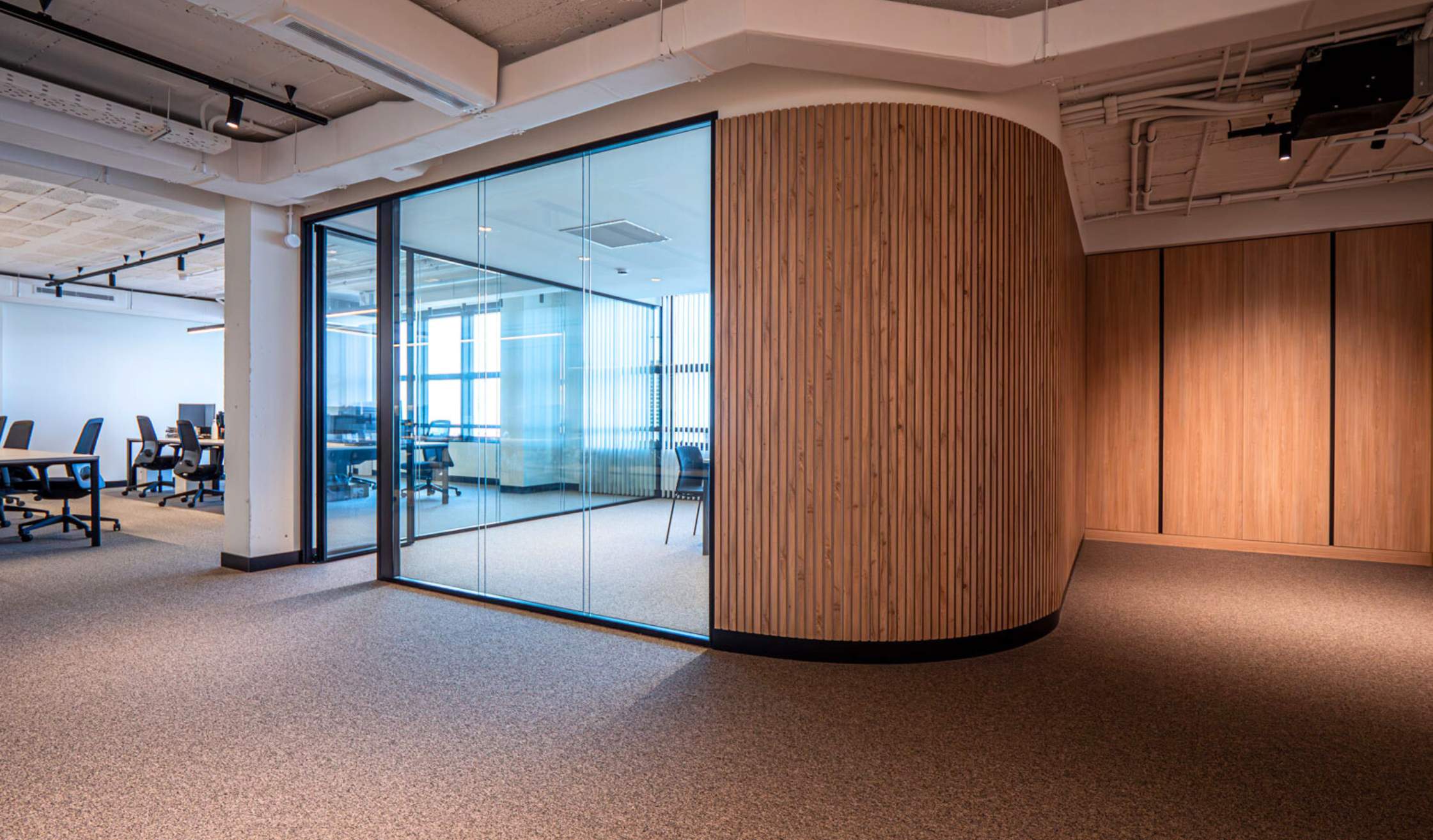 Esto se trató de un reto a resolver, buscando un equilibrio entre la fuente de luz natural y la adecuada climatización del espacio, así como su solución a nivel físico. Para solventarlo, los equipos de Diseño e Ingeniería trabajaron codo con codo para encontrar la solución perfecta para el Workplace.
