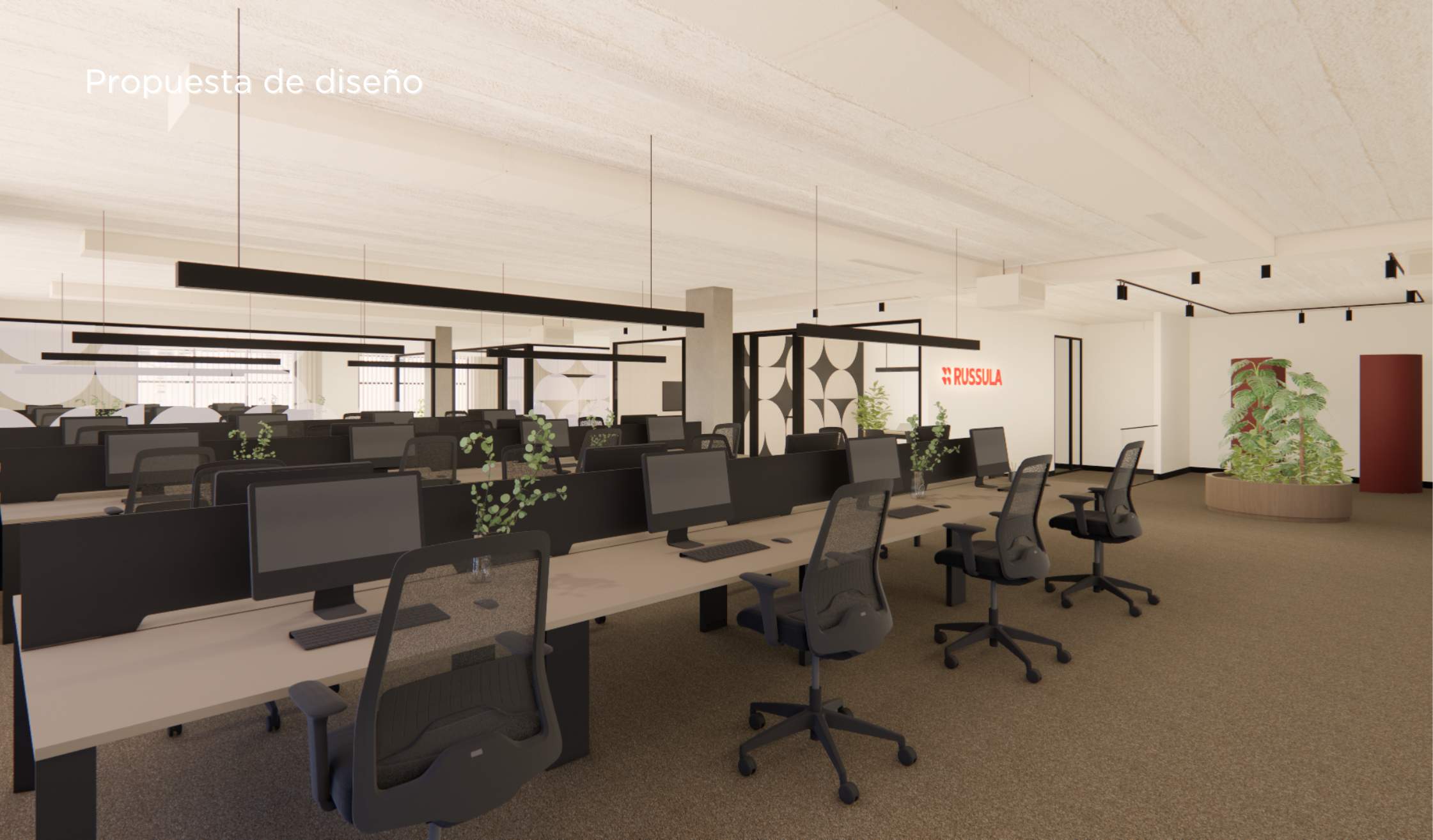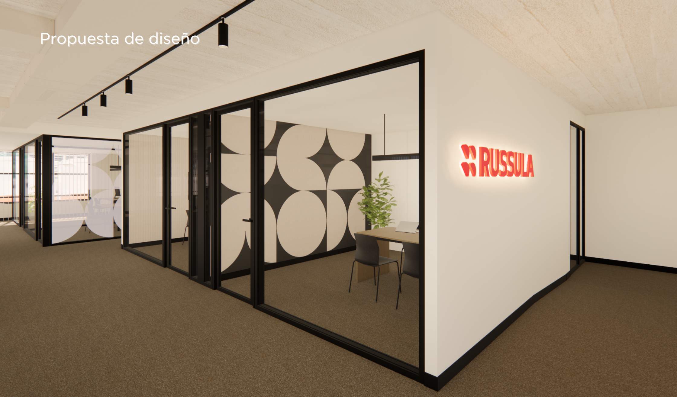 - Panelado acústico en diversas zonas, jugando con las formas del logo de Russula para la estética.