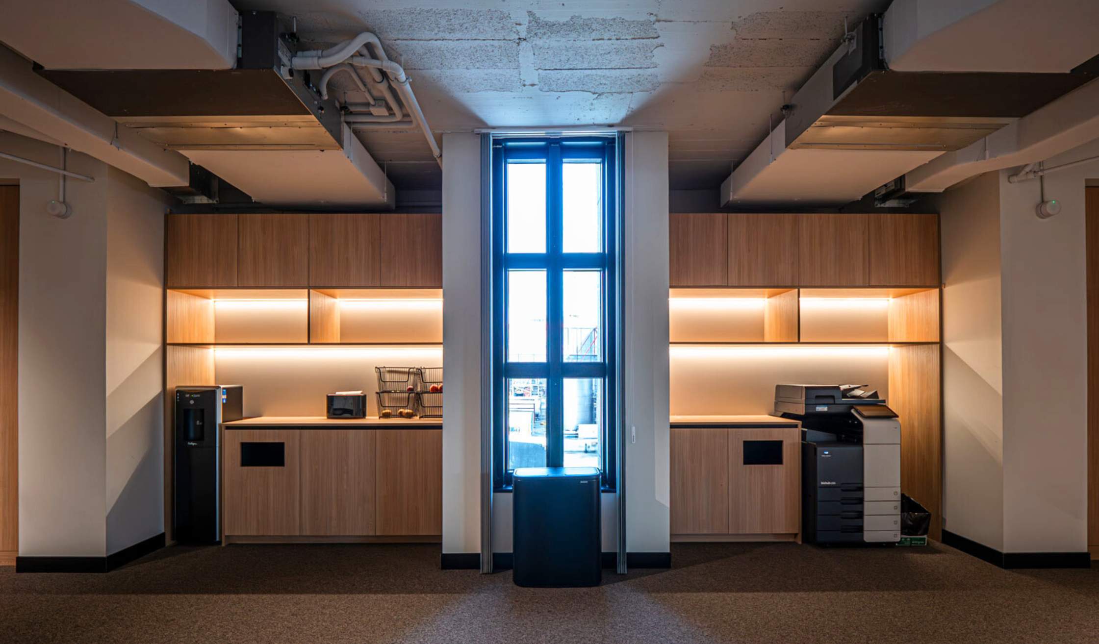 Los trabajos de carpintería a medida incluyeron el diseño, fabricación, ejecución e instalación de mobiliario personalizado para distintas zonas de la oficina, como por ejemplo la zona de impresión o las mesas de gran formato de salas de reuniones o despachos.