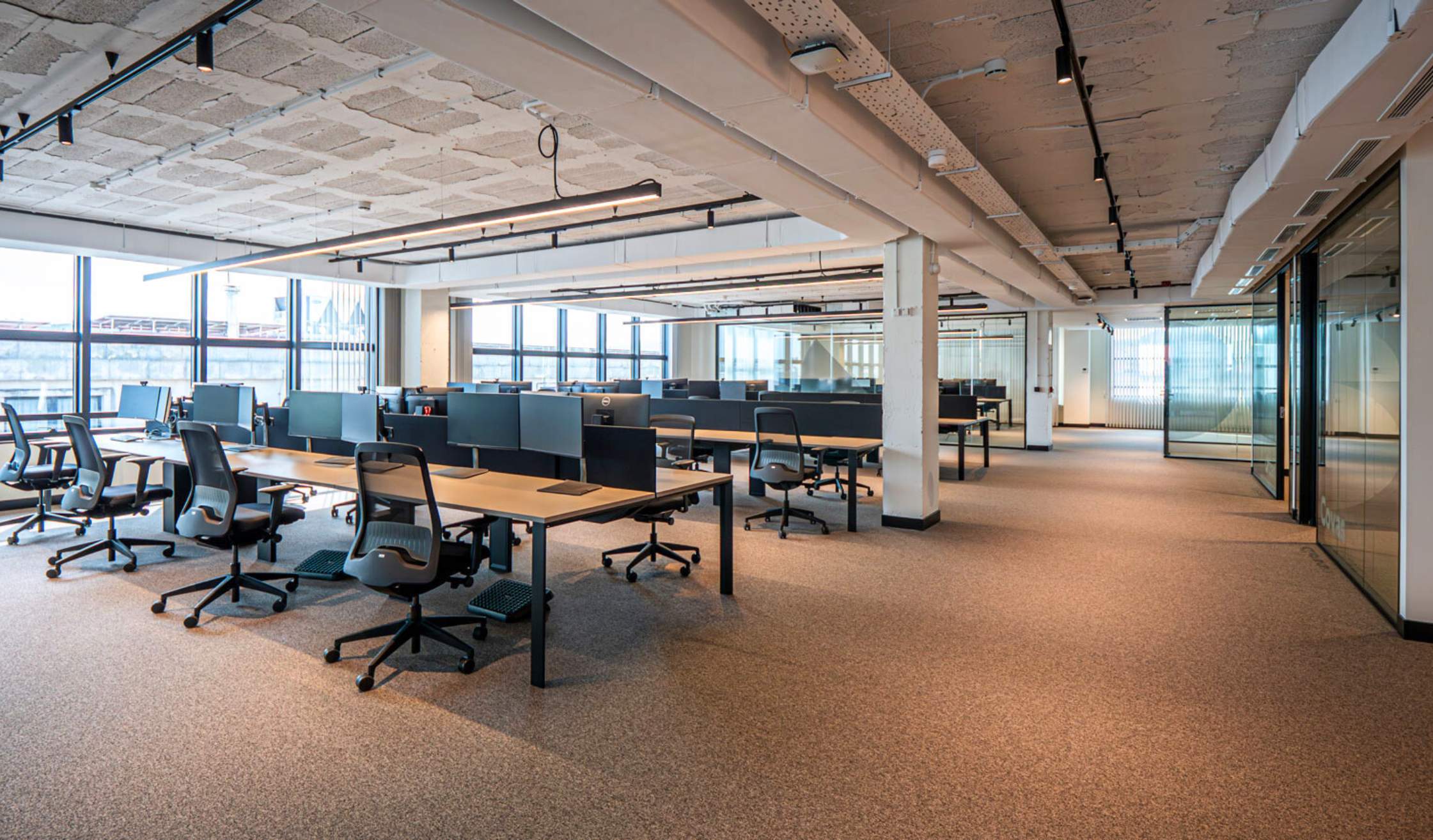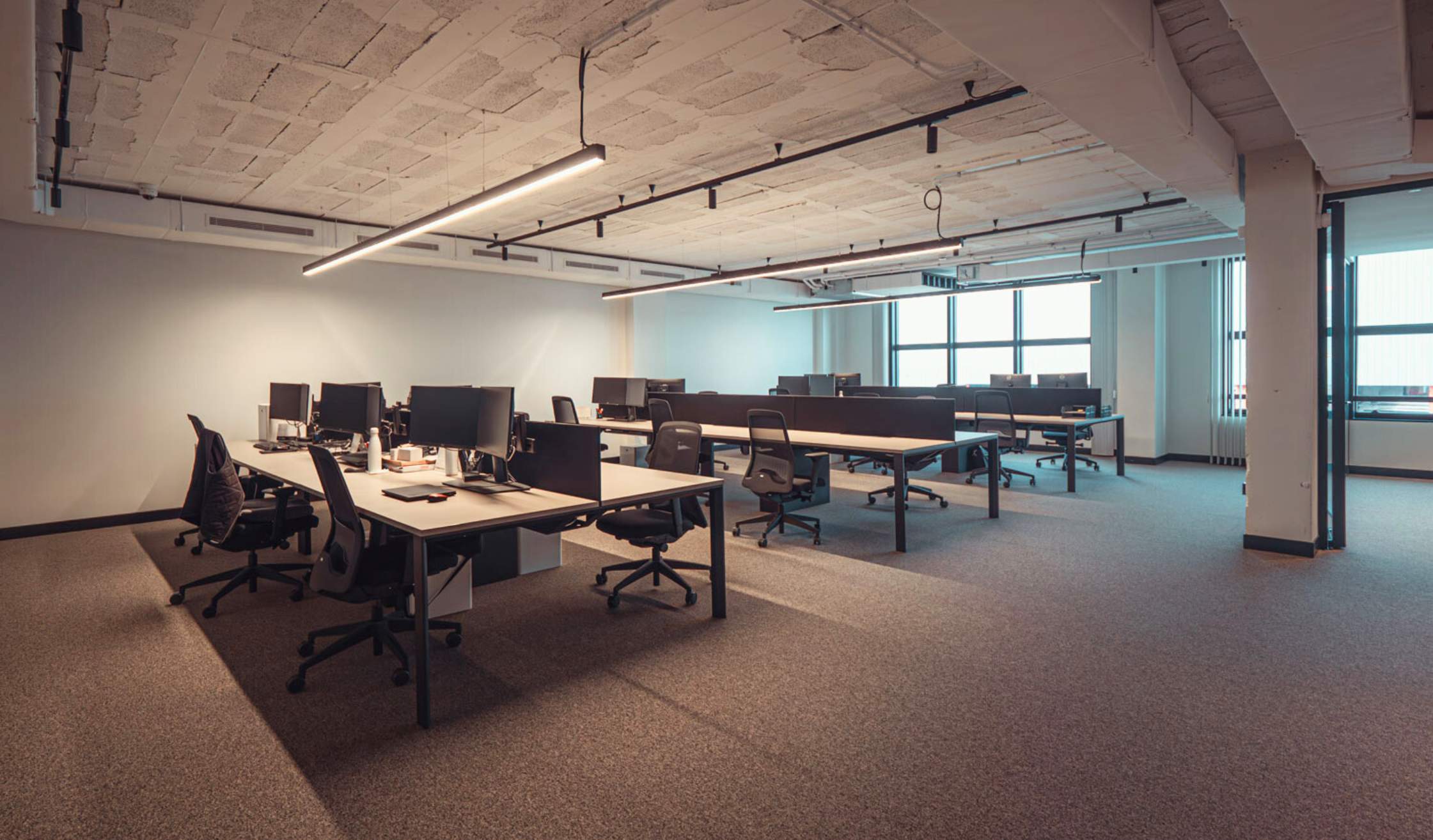 - Puestos de trabajos operativos, situados en una zona “open-space” en el contorno del espacio, colocados junto a las fuentes de luz natural y al lado de las ventanas.