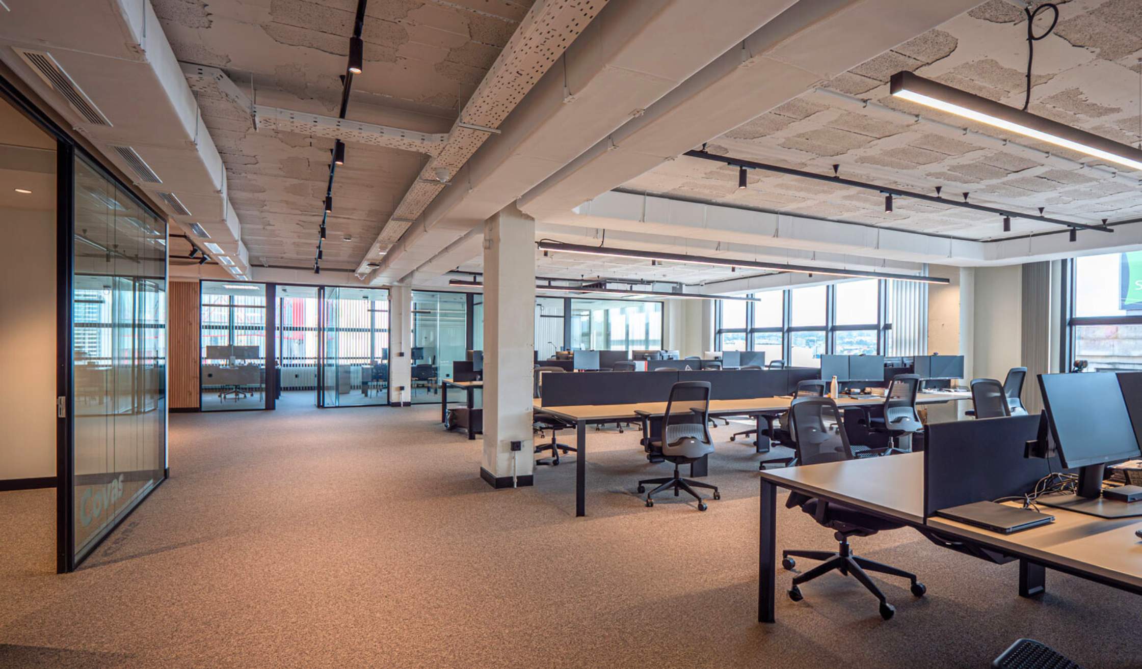 Una de las características a tener en cuenta a la hora de diseñar la nueva oficina era que el perímetro del edificio estaba compuesto totalmente por ventanal al exterior, lo que tenía la ventaja de una gran luminosidad natural, pero inconvenientes a nivel de climatización, instalaciones y posibles reflejos.